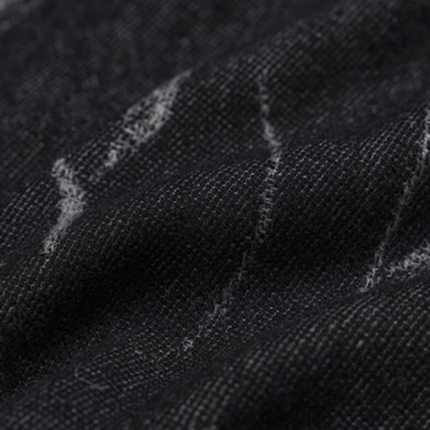 黒色の下地に、暗灰色で細部まで描き込まれた薔薇と棘のある蔓の模様が全体に広がっています。リバーシブルのように色が反転して見える織り構造です。