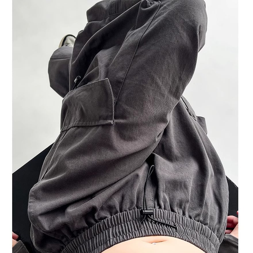 裾には調節可能な紐が内蔵されており、シルエットを変更できます。素材の詳細は画像からは不明です。