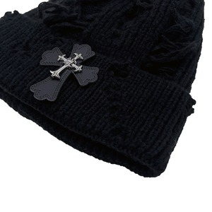 クロスモチーフ付き クラッシュ加工ニットビーニー|サブカル・ゴシック対応 ユニセックス帽子|天使と悪魔