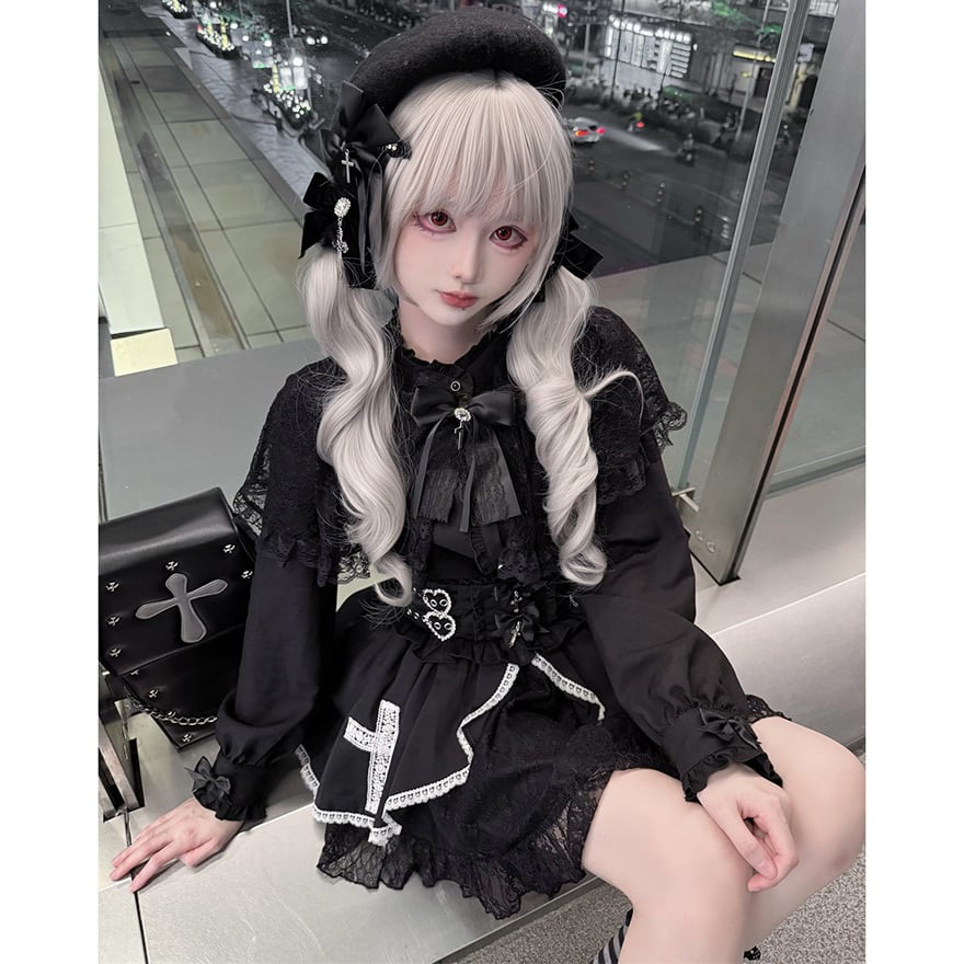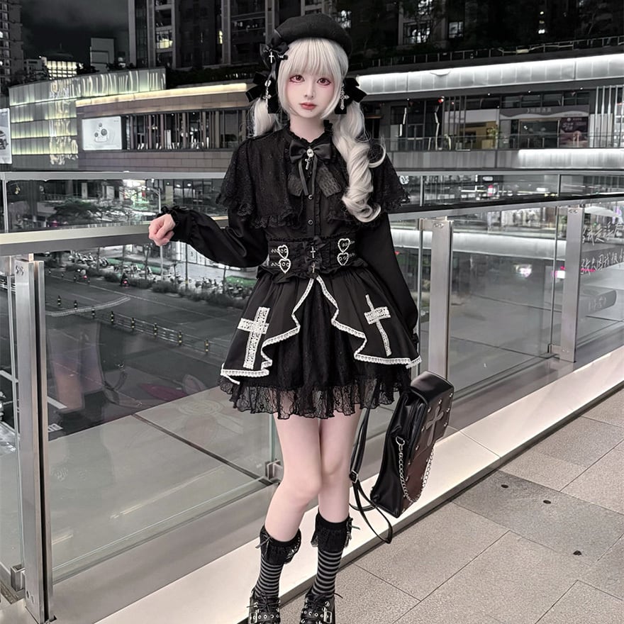 クロスモチーフ付き ゴシックロリータ ミニスカート|コルセット風ウエスト×レース重ね|天使と悪魔