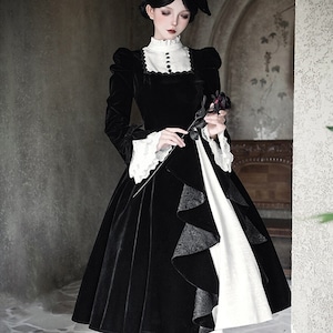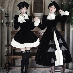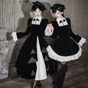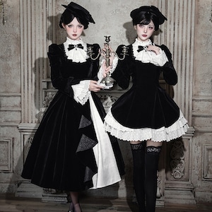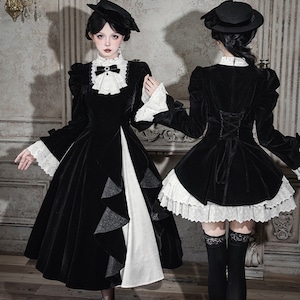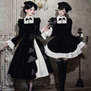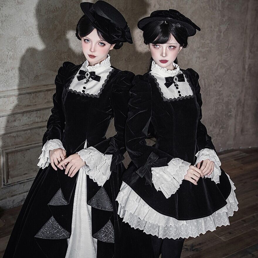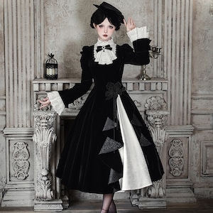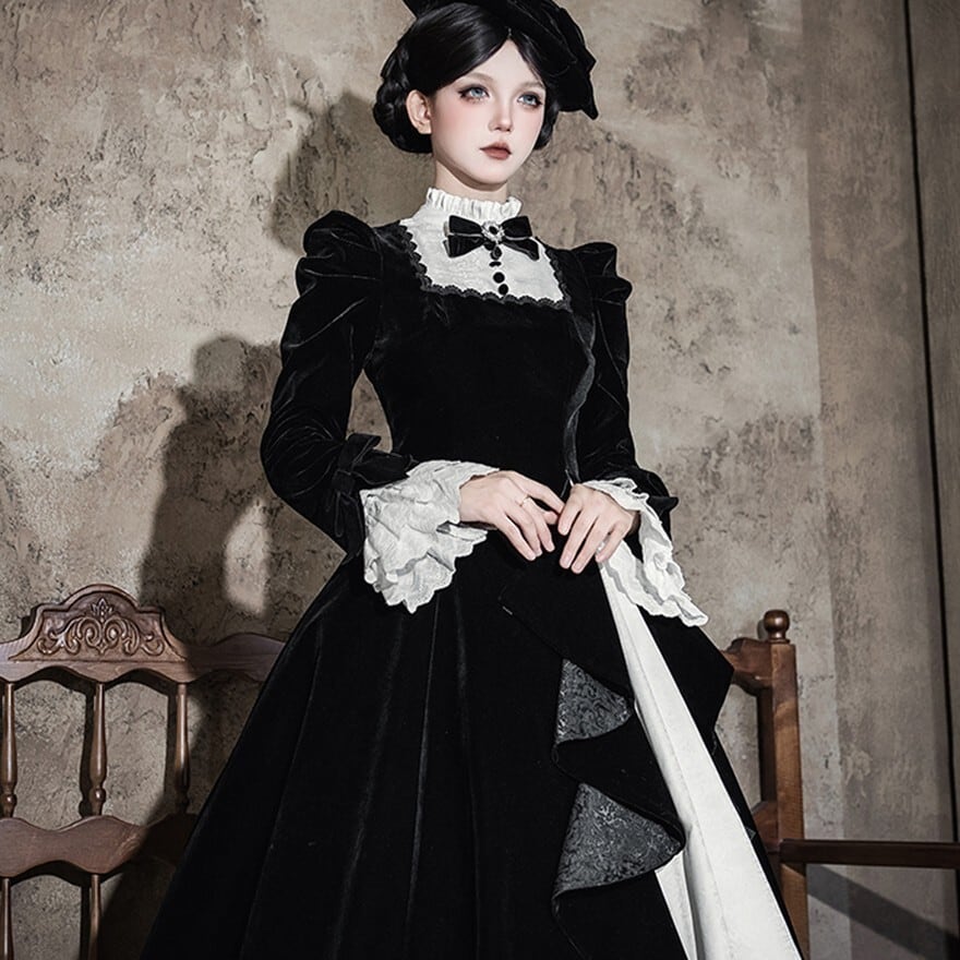 商品要約文 静寂に包まれた教会の聖女を思わせる、耽美なベロア素材のゴシックロングドレス。 しっとりとした重厚な黒と、清廉な白フリルのコントラストが、あなたの佇まいを神秘的なドールへと変身させます。 ジャボタイやミニハットまで揃ったフルセットで、届いた瞬間、完璧な「非日常の孤独」を纏える至高の一着です。