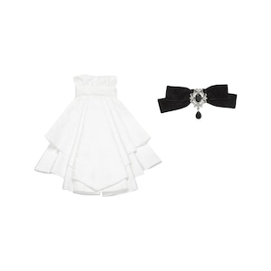 ◆【デザイン・素材の特徴】 高級感溢れる漆黒のベロア生地に、繊細な白のラッフルフリルを多層に重ねたバイカラーデザイン。 顔周りを高貴に彩るボリュームジャボタイと、大粒のビジューが輝くリボンブローチが、視線を釘付けにします。 ウエストをシェイプしつつ裾に向けて広がるAラインと、手元を華奢に見せる袖口のフリルが、徹底的にドールらしさを追求しています。