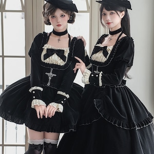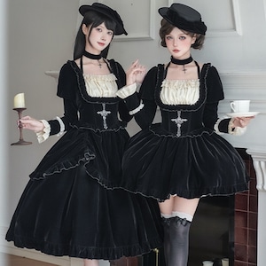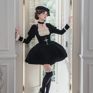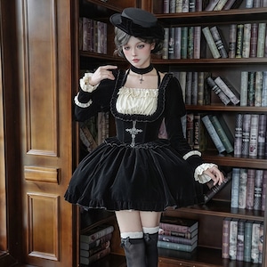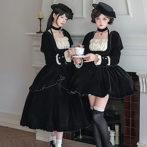 高級感漂う漆黒のベロア生地をベースに、胸元や袖口には清廉な生成り色のフリルが贅沢に施されています。