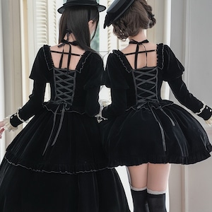 高級感溢れる黒のベロア風生地をメインに、襟元や袖口には清廉なホワイトのフリルレースを贅沢にあしらっています。