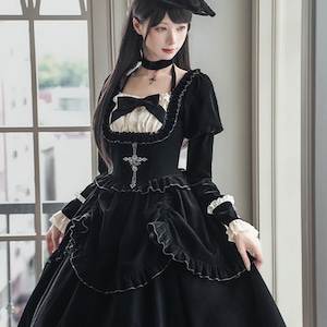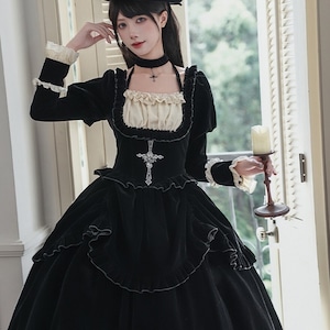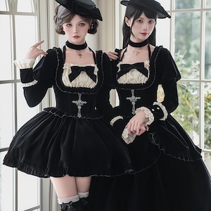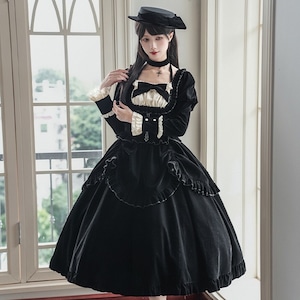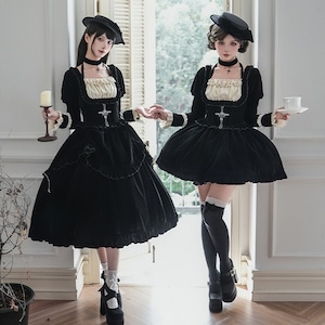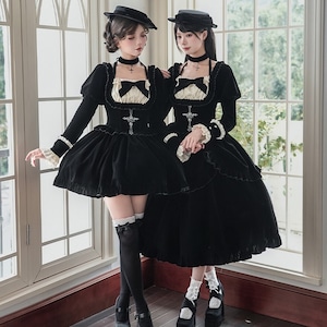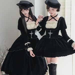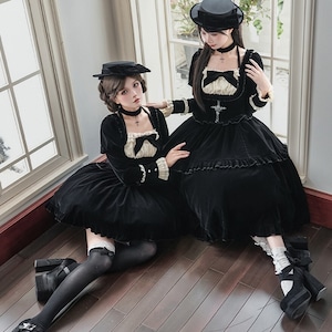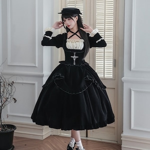 深淵の黒ベロア・ゴシックセットアップ 4点セット(ジャボタイ・ビジューブローチ付)|天使と悪魔