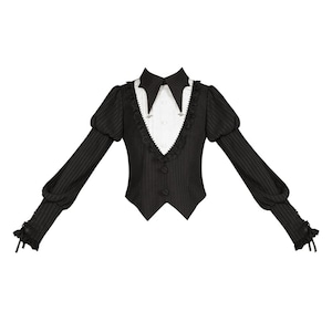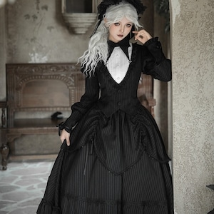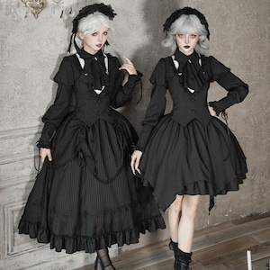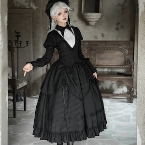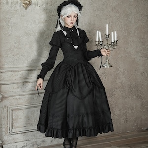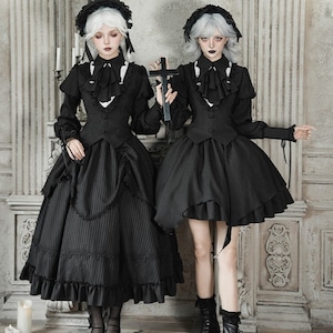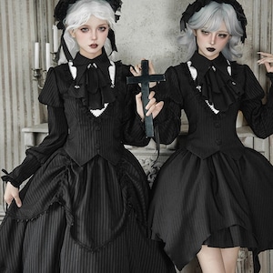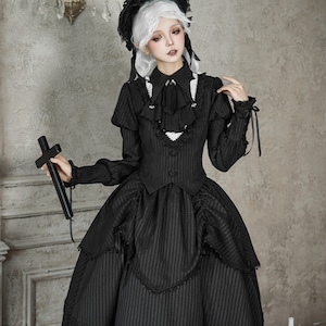 繊細なストライプ柄が描く、凛とした気品とダークな可愛さが同居するゴシックセットアップ。