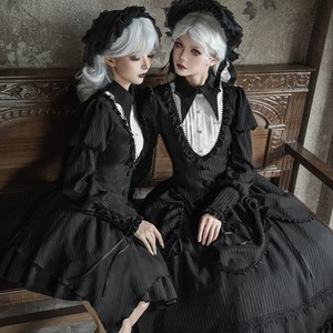 落ち着いた光沢のあるストライプ生地をベースに、随所に漆黒のフリルと繊細なレースをあしらっています。