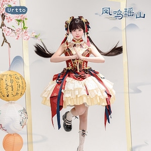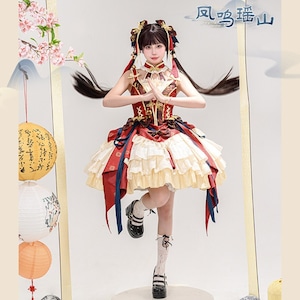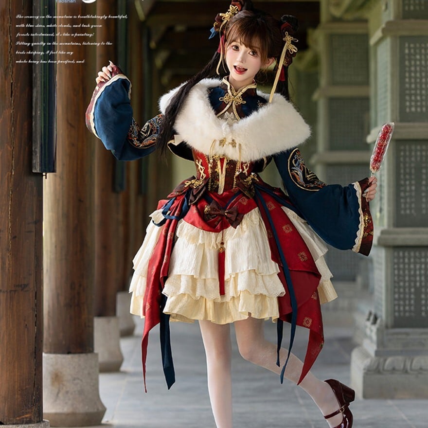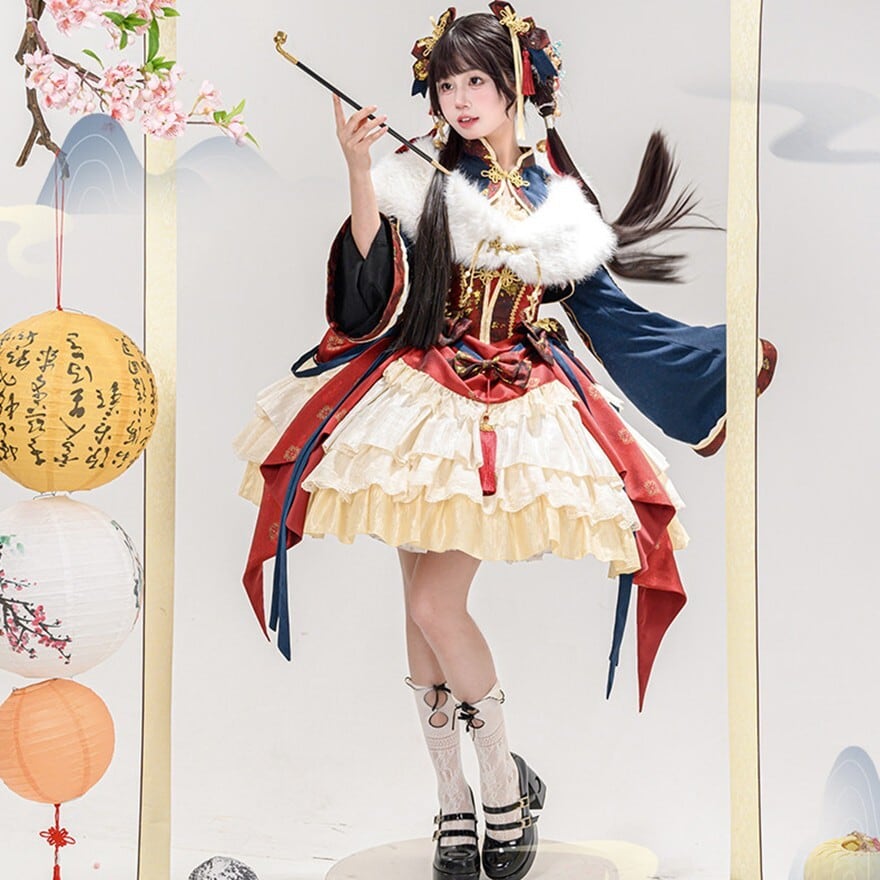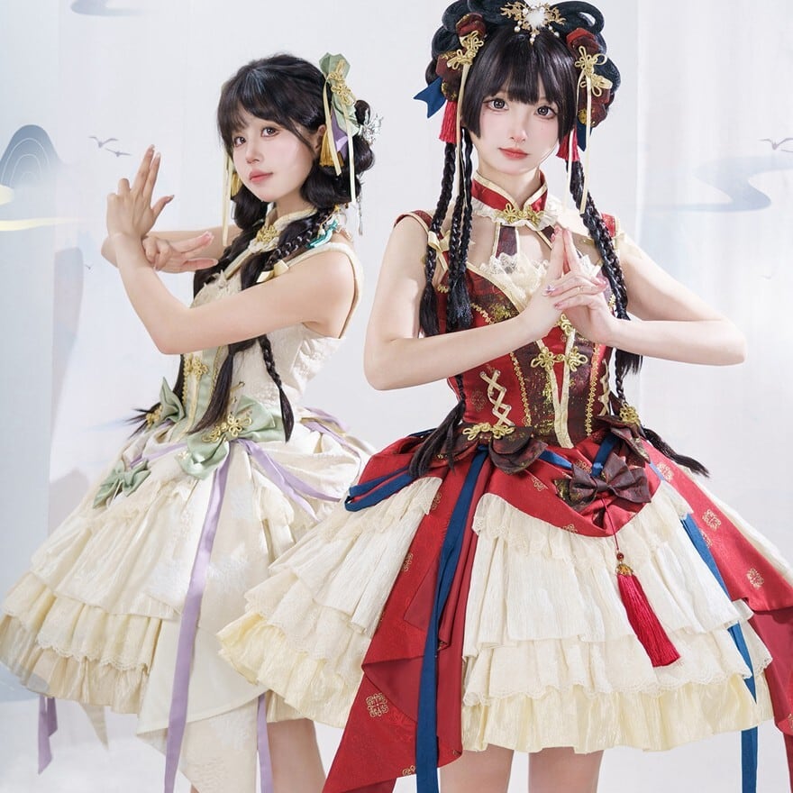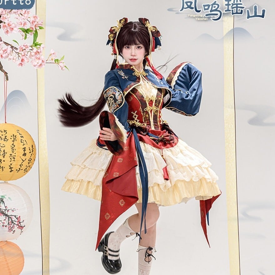 伝統的な中華デザインと現代のアイドルスタイルが融合した、華やかさ溢れるセットアップです。鮮やかな赤と紺のコントラストに、贅沢なフリルと繊細な刺繍がステージでの「主役感」を演出。ジャケットの着脱で表情が変わるため、ライブからイベントまで、自分らしい個性を爆発させたい10代〜20代に最適な1着です。