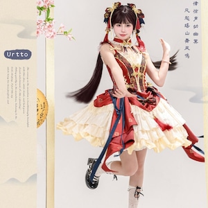 ・赤を基調とした華やかなチャイナドレス風ワンピースに、金色のチャイナボタンがアクセントを添えます。