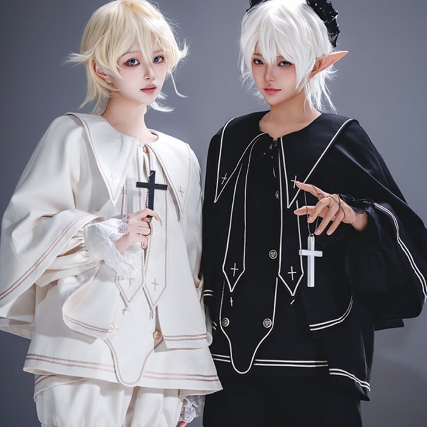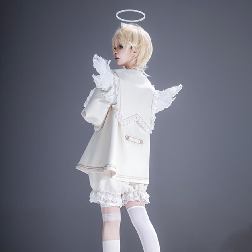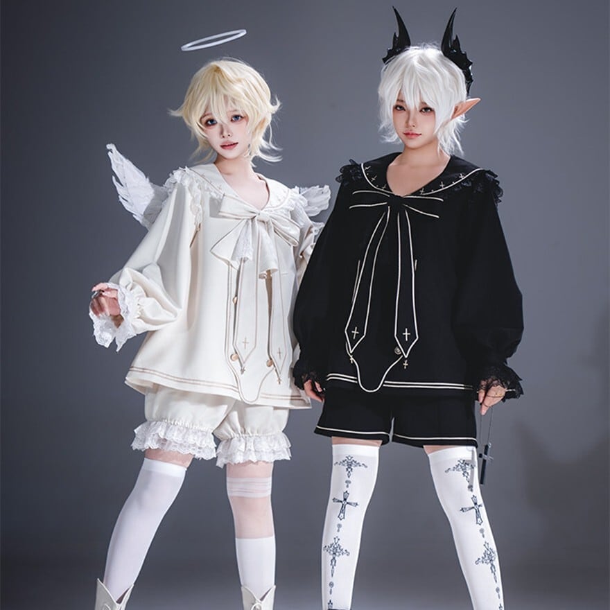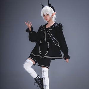 幼さと気品が同居する、理想の「王子様」を叶える少年装4点セットです。セーラー風の上衣、ハーフパンツ、ネッカチーフ、リボンがセットになり、纏うだけで物語の主人公のような佇まいに。地雷系やゴシックな世界観を愛する10代〜20代へ贈る、コンカフェやライブ衣装に最適な通販限定の勝負服です。