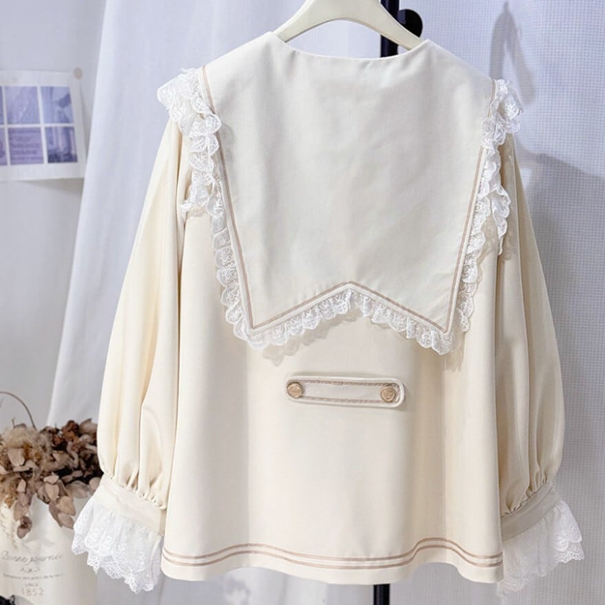 ・気品あるネイビーを基調に、ホワイトのラインが映えるセーラー風の上衣。