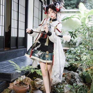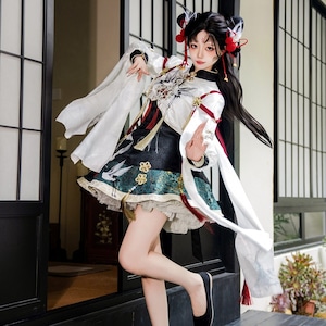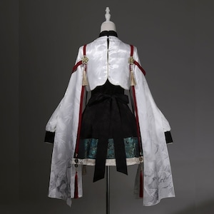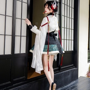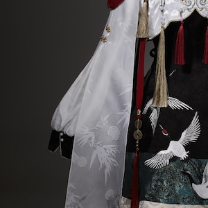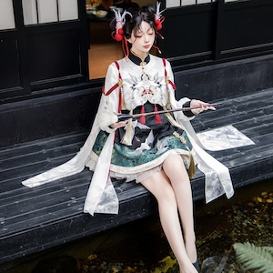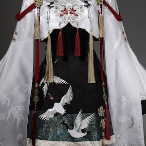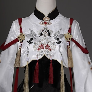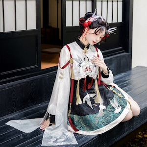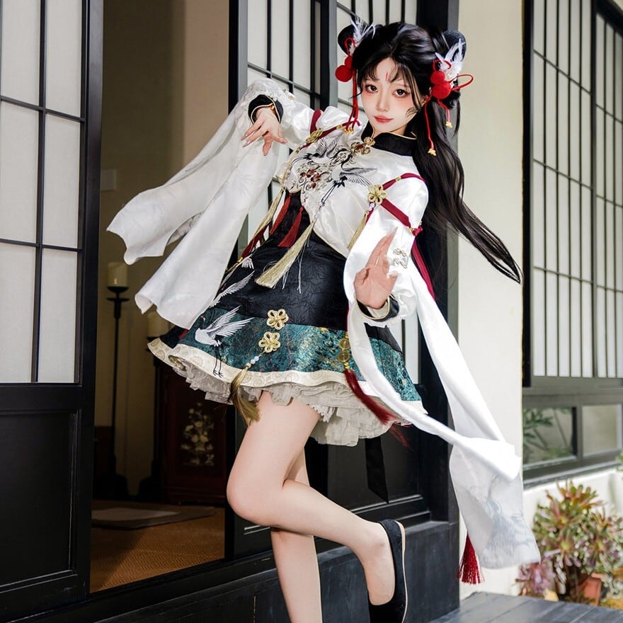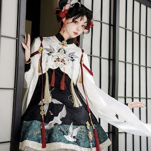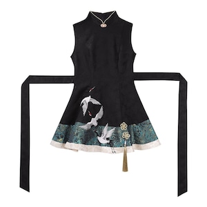ジャンパースカート、ロングスリーブボレロ、チャイナボタン付きチョーカーの豪華3点セット。赤の差し色が効いたタッセルと、高級感溢れるゴールドのパイピングが細部にまで施されています。生地には光沢のある地紋入り素材を使用し、裾には銀糸を用いた鶴のグラフィックを配置