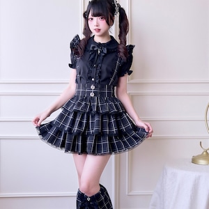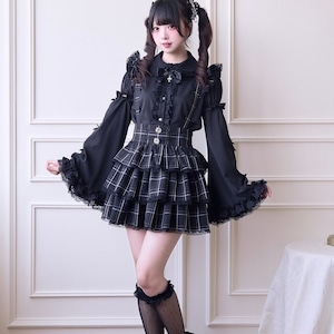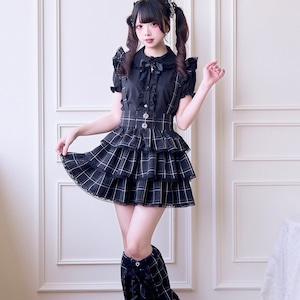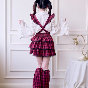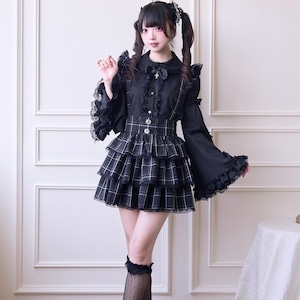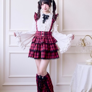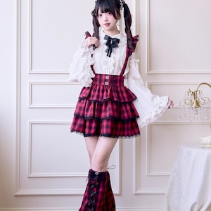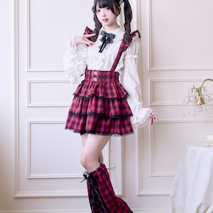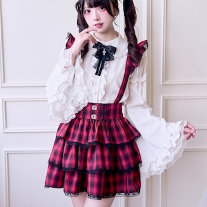 シックなチェック柄に、フリルやリボンのディテールが華やかさを添えるサスペンダースカート。
