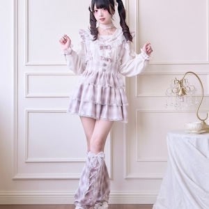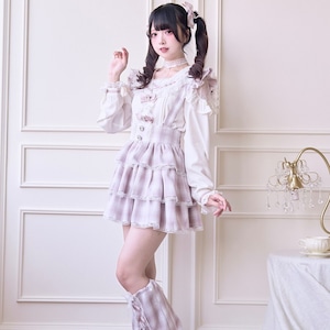 贅沢な3段ティアードフリルの裾には、細やかなレースを配置。ウエストにはアクセントとなる2つの大粒ビジューボタンをあしらいました。カラーは王道の赤×黒、シックな黒×白、可憐なピンクベージュの3色展開。サスペンダー部分はフリル付きで、バックスタイルまで隙のない「360度可愛い」を追求したこだわりの設計です。