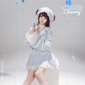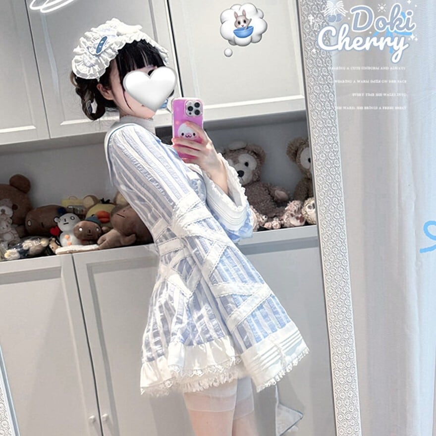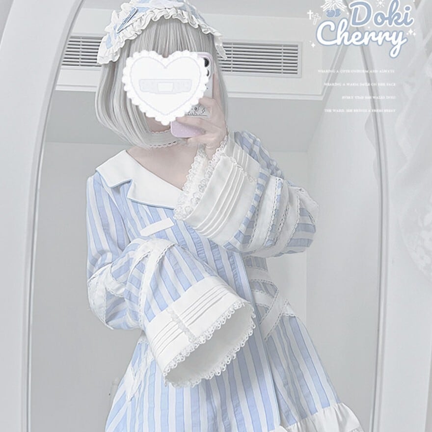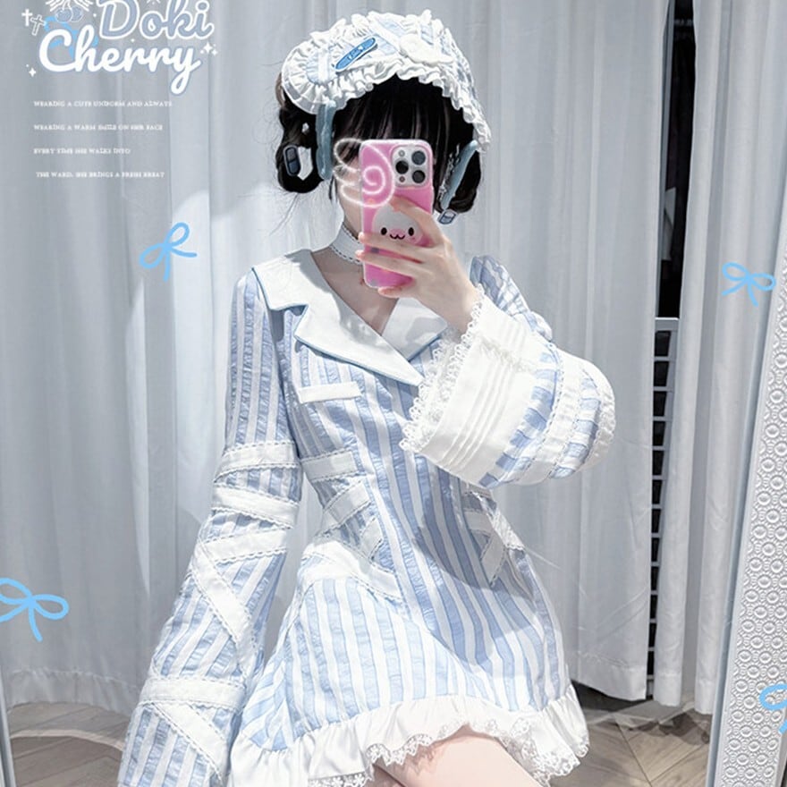 淡いブルーのストライプ地とホワイトレースの2色のナース風ヘッドドレスです
