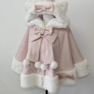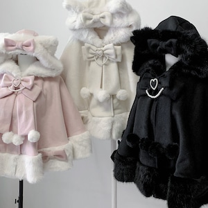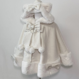 大きなリボンとふわふわのファーが、まるでお人形のような可愛らしさを演出する一着です。