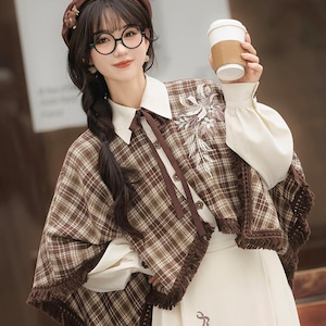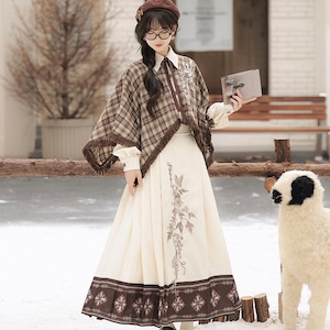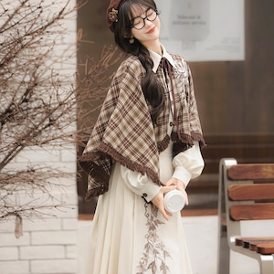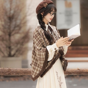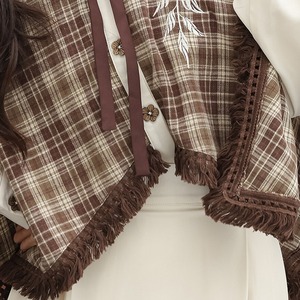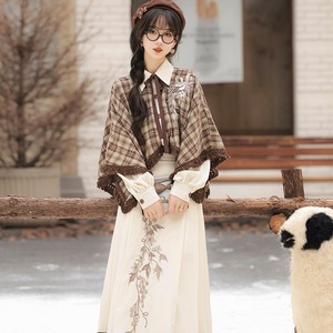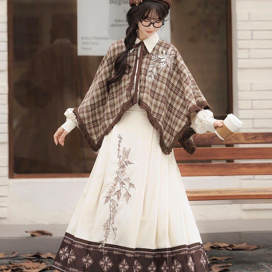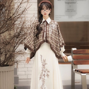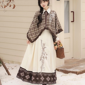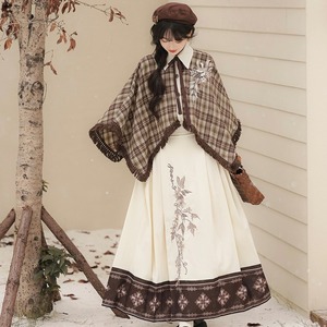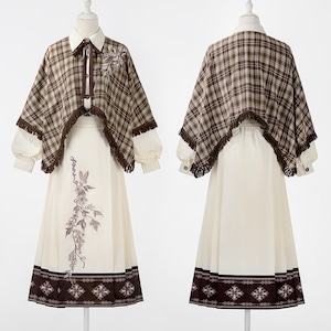 チェック柄ケープ、刺繍入りロングスカートの2点構成。