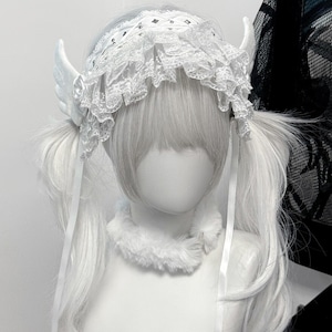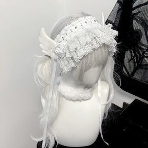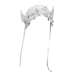 長いリボン付きで、ツインテールやウィッグの上からも安定して装着可能。白一色ながら異素材ミックスで高級感があります。