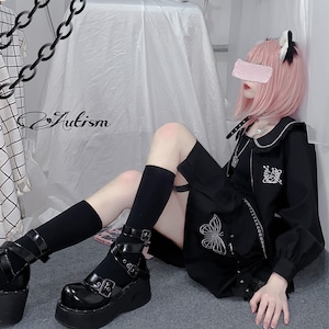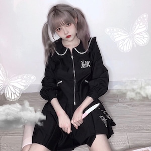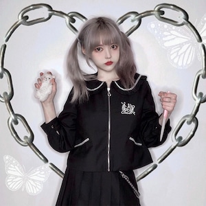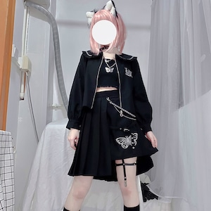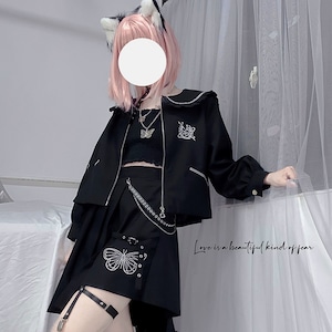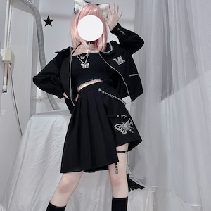 ブラックベースにベルト&ジップデザインを効かせた地雷系ゴシックセットアップ。ゆるっと羽織れるトップスと美脚見えボトムのバランスで、ライブ参戦やイベントで圧倒的存在感を演出します。Lサイズのみ現品即納。