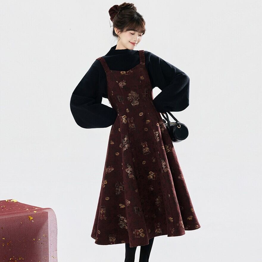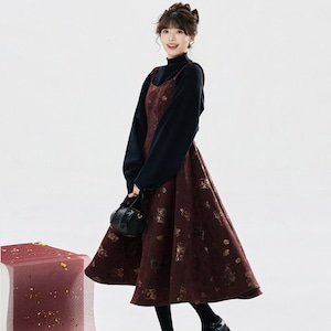 「普通のニットは着太りして見える」とお悩みの方へ。たっぷりとしたドルマンスリーブが、気になる二の腕や肩周りを自然にカバー。さらにハイウエストのジャンパースカートを合わせることで、脚長効果とメリハリのあるシルエットを同時に叶えます。体型を隠しながら、誰よりもお洒落に冬の装いを楽しめるセットです。