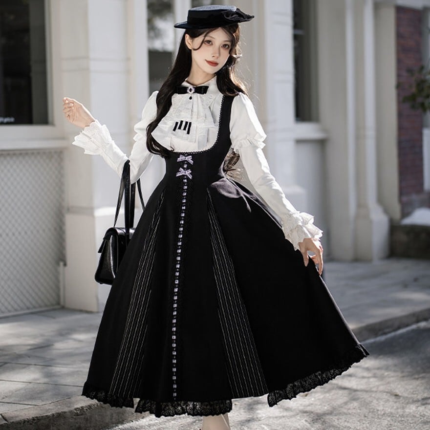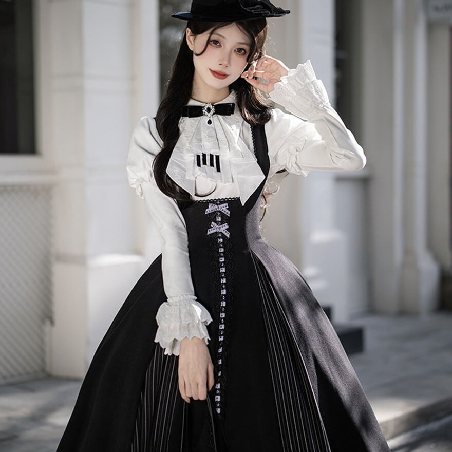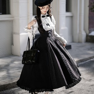 クラシカルロリィタ 5点セット(ロングJSK、ブラウス、胸当て、リボンタイ、礼帽)