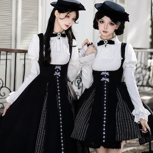 【3点フルセット】ロングJSK×ブラウス×ハット|黒 ロリータ ストライプ切替|天使と悪魔