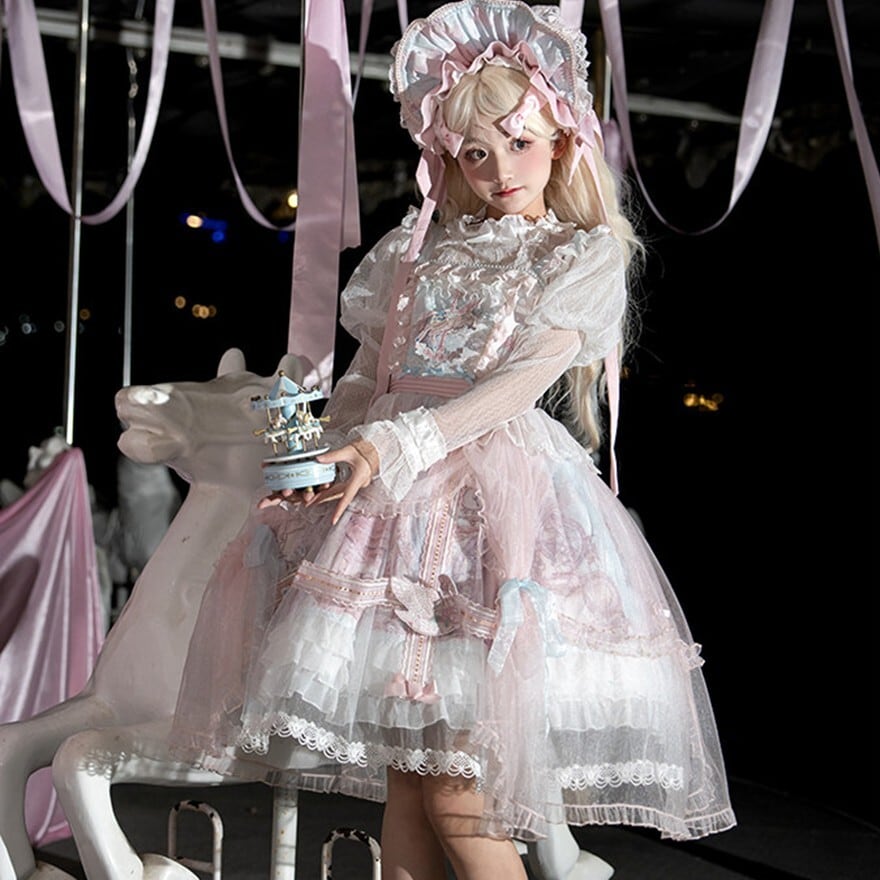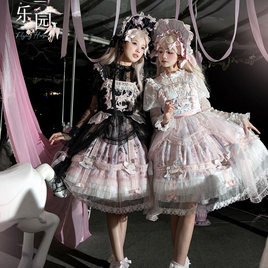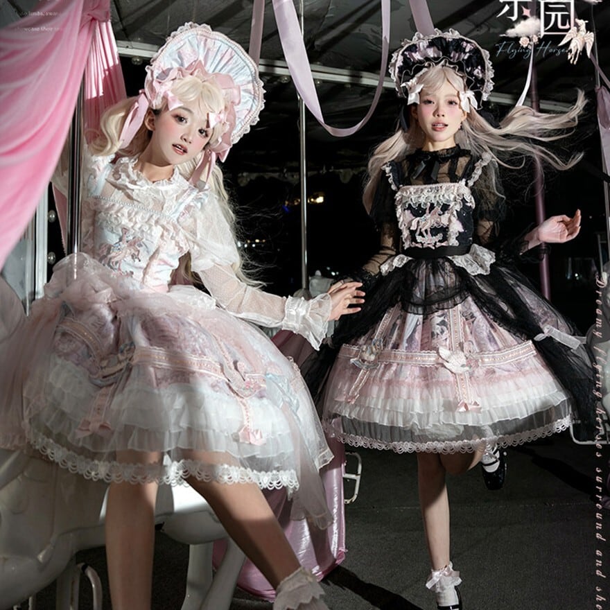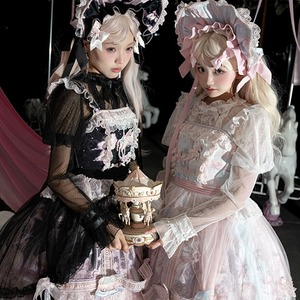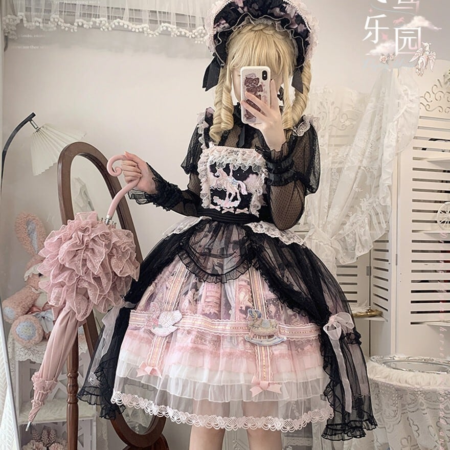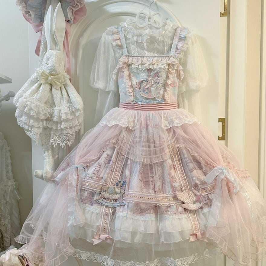 メリーゴーランドの幻想的なプリントが目を引く、多層フリルが豪華なロリィタJSKです。胸元の刺繍と繊細なレース重ねが気品溢れるシルエットを演出。パニエで膨らませれば、お茶会やイベントで主役級の存在感を放ちます。甘いピンクとシックな黒、表情の異なる2色展開で、あなたのドールスタイルを完璧に仕上げます。