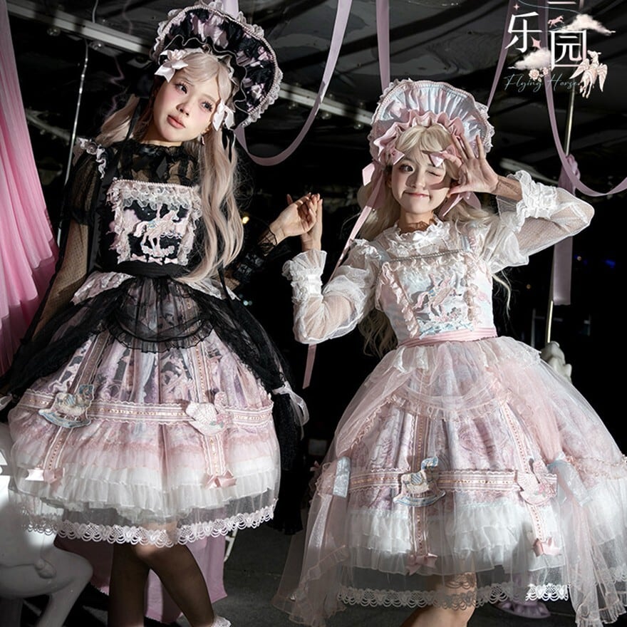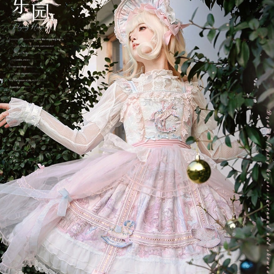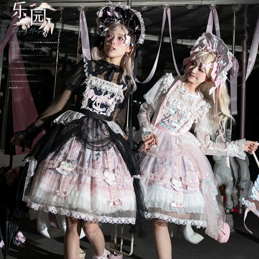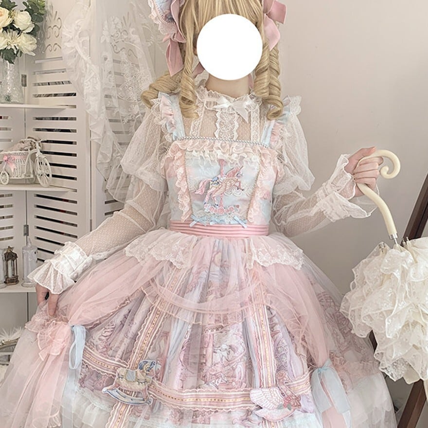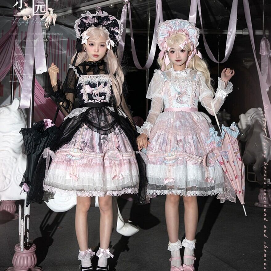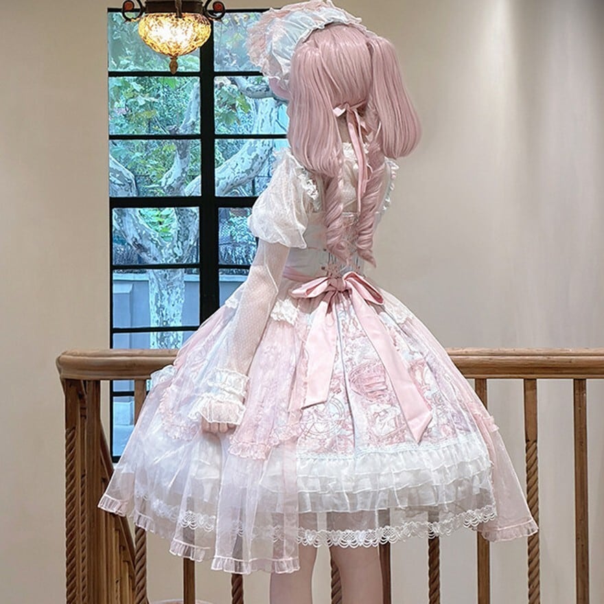 メリーゴーランドの幻想的なプリントが目を引く、多層フリルが豪華なロリィタJSKです。胸元の刺繍と繊細なレース重ねが気品溢れるシルエットを演出。パニエで膨らませれば、お茶会やイベントで主役級の存在感を放ちます。甘いピンクとシックな黒、表情の異なる2色展開で、あなたのドールスタイルを完璧に仕上げます。