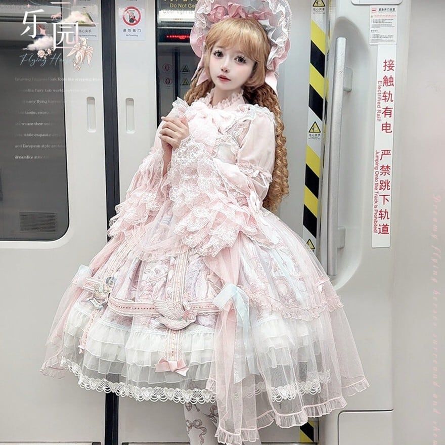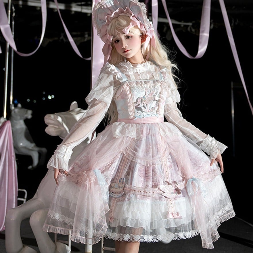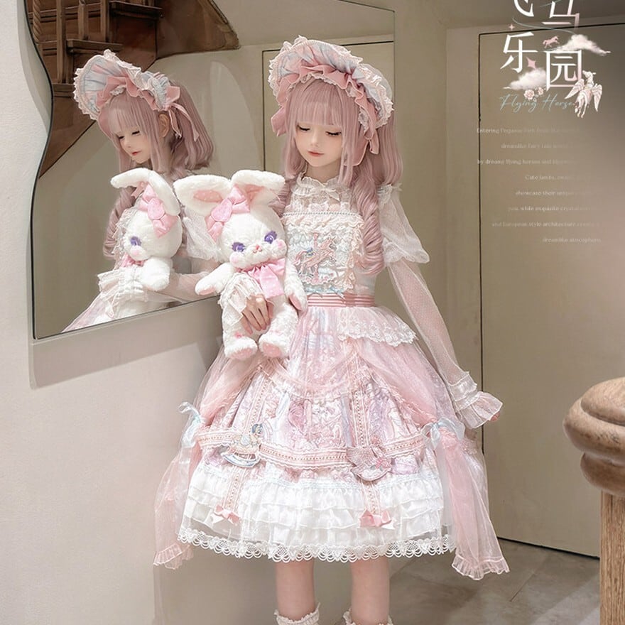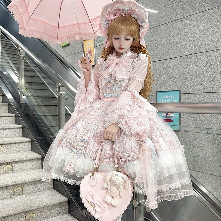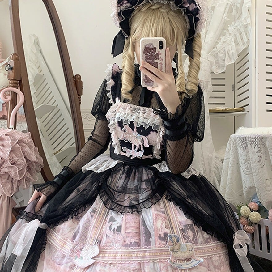 メリーゴーランドの幻想的なプリントが目を引く、多層フリルが豪華なロリィタJSKです。胸元の刺繍と繊細なレース重ねが気品溢れるシルエットを演出。パニエで膨らませれば、お茶会やイベントで主役級の存在感を放ちます。甘いピンクとシックな黒、表情の異なる2色展開で、あなたのドールスタイルを完璧に仕上げます。