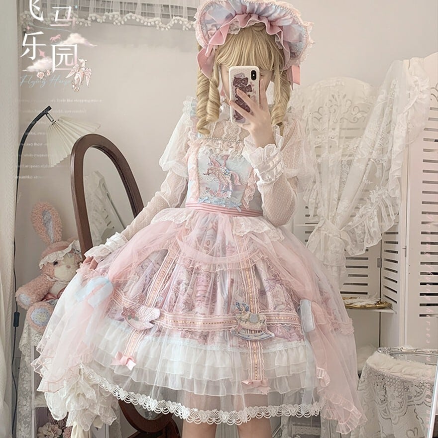 推し活 甘ロリ豪華JSK|メリーゴーランド柄フリルジャンパースカート レース重ね 鳥かごパニエ付き|天使と悪魔