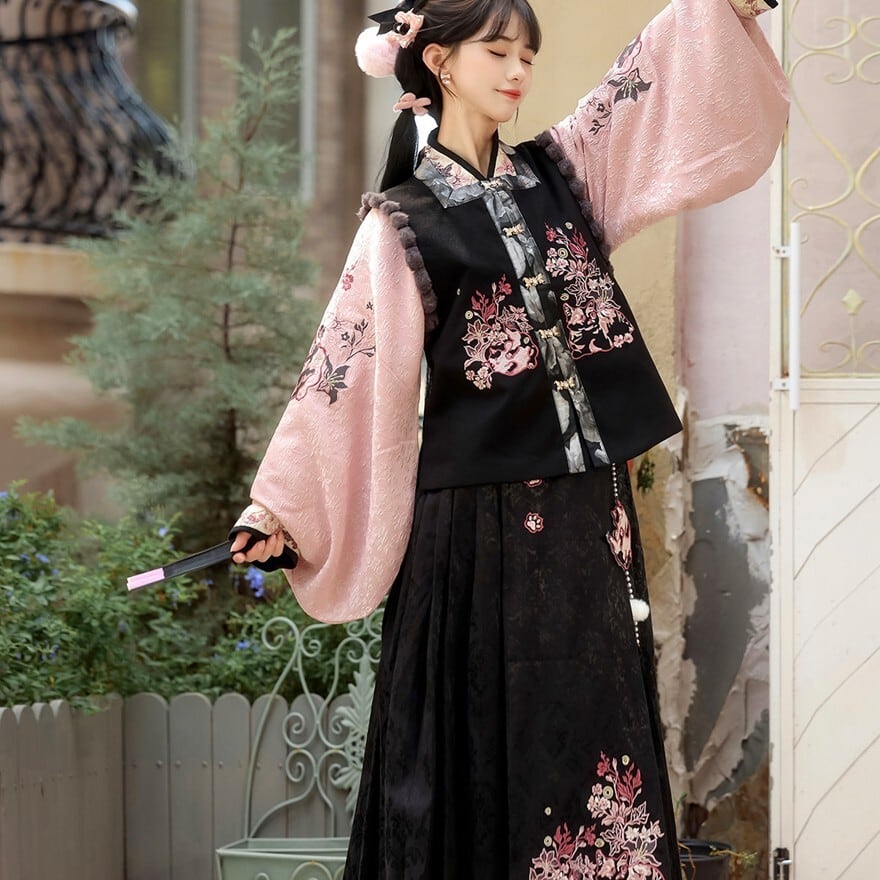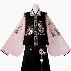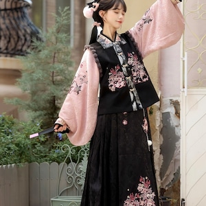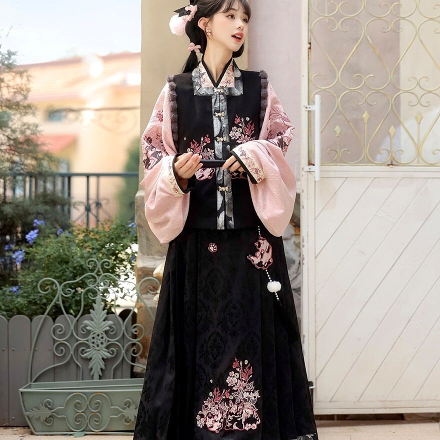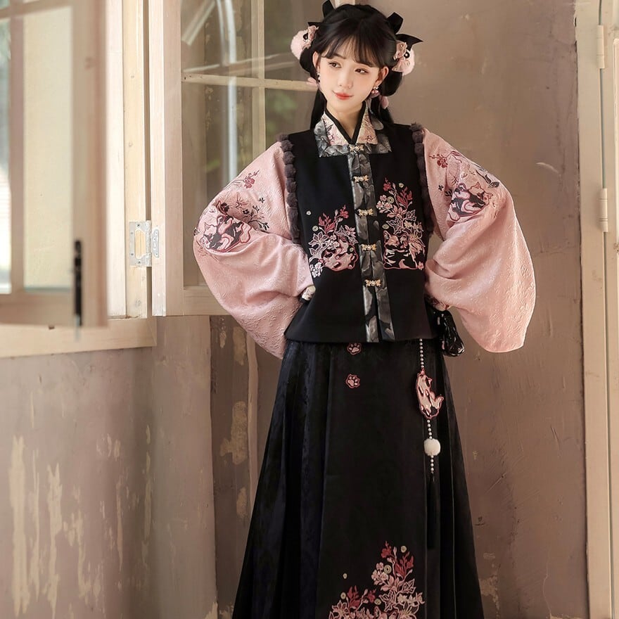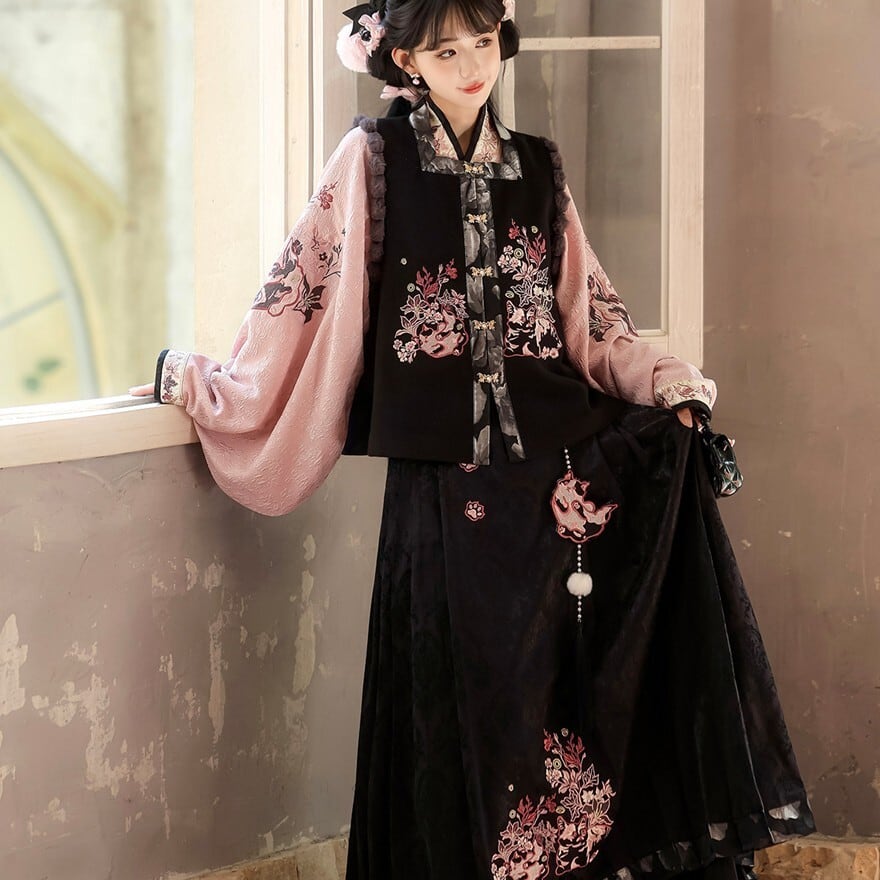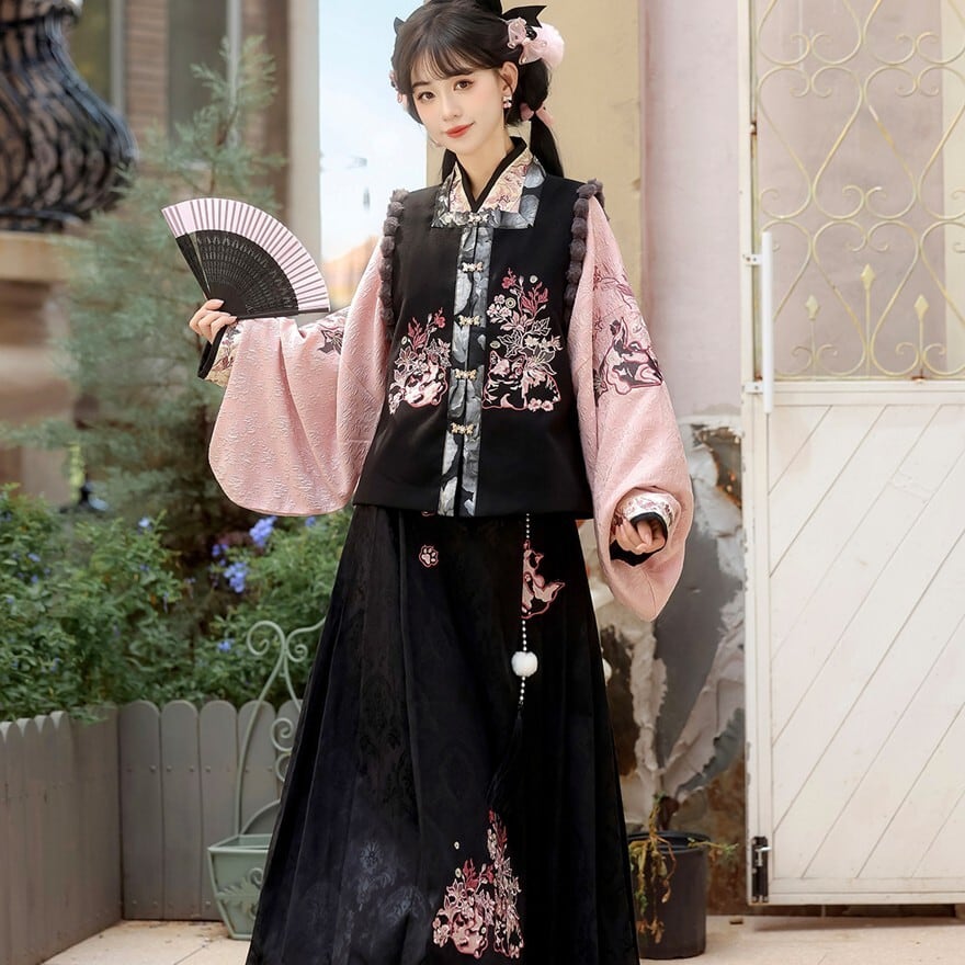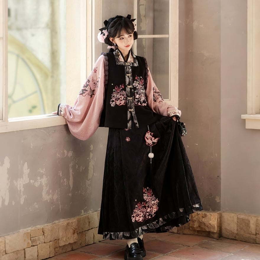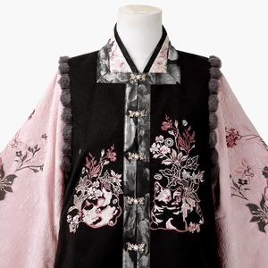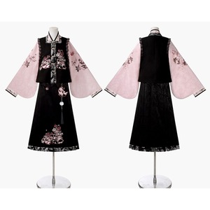 和の情緒とゴシックの耽美さが融合した、豪華な3点セットです。繊細な刺繍を施したベスト、優雅に揺れる広袖トップス、そして気品あるロングスカートが、唯一無二のシルエットを描きます。ピンクと黒の配色が甘すぎず、凛とした大人の可愛らしさを演出。お茶会やイベント、特別な日の装いにふさわしい一着です。