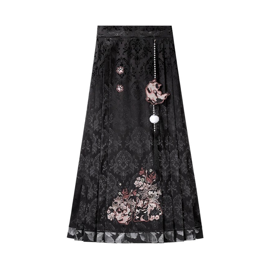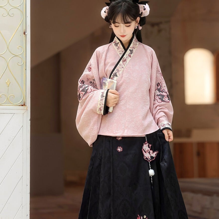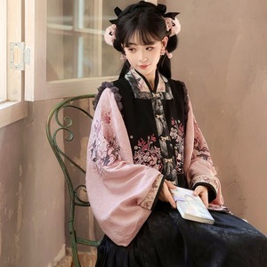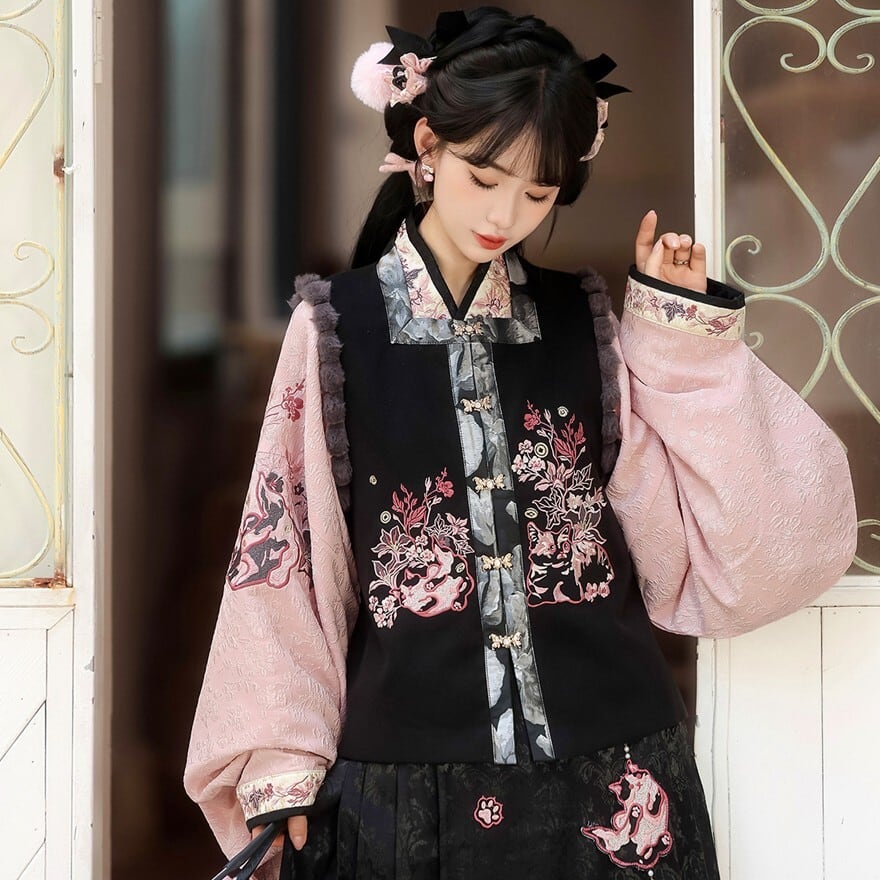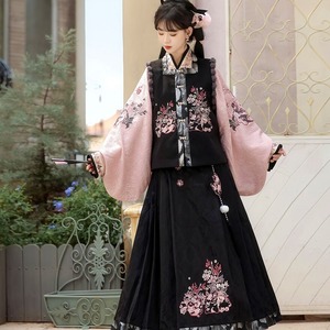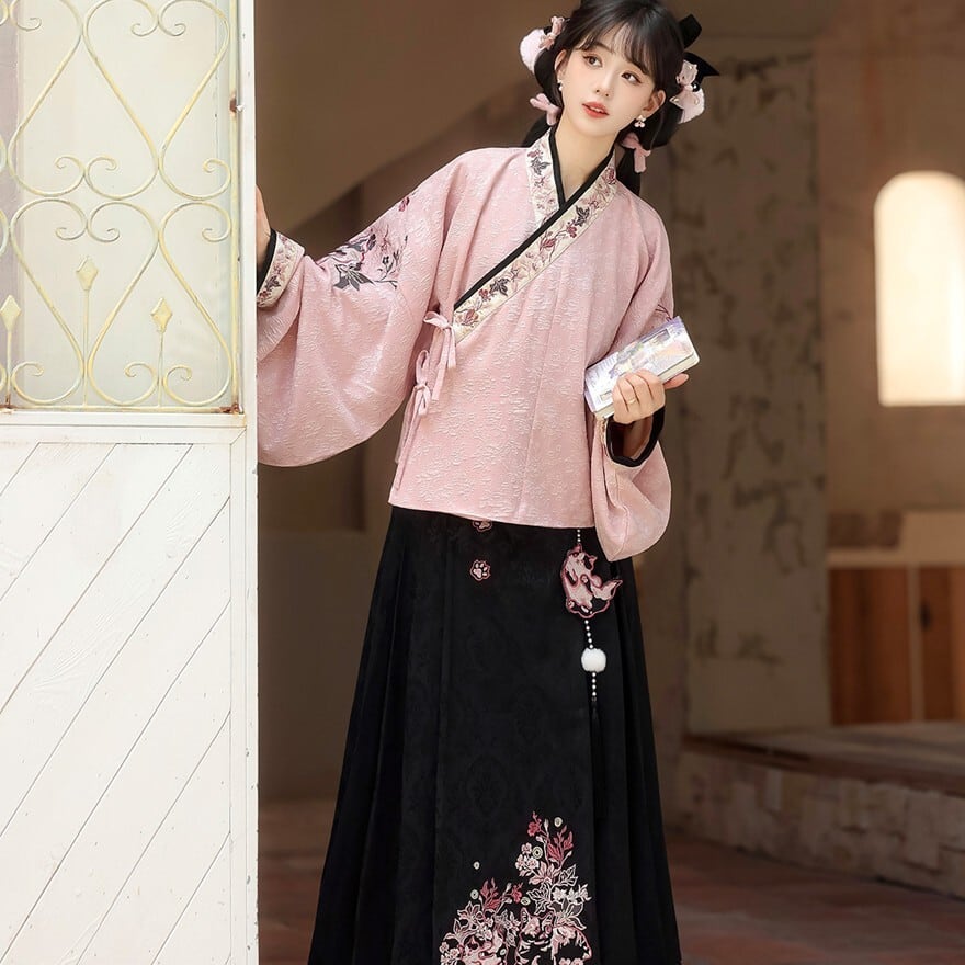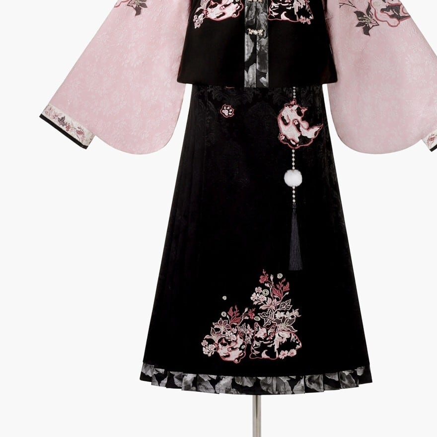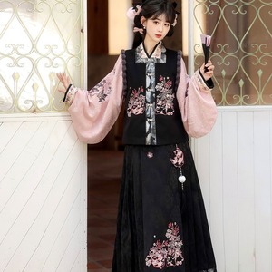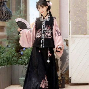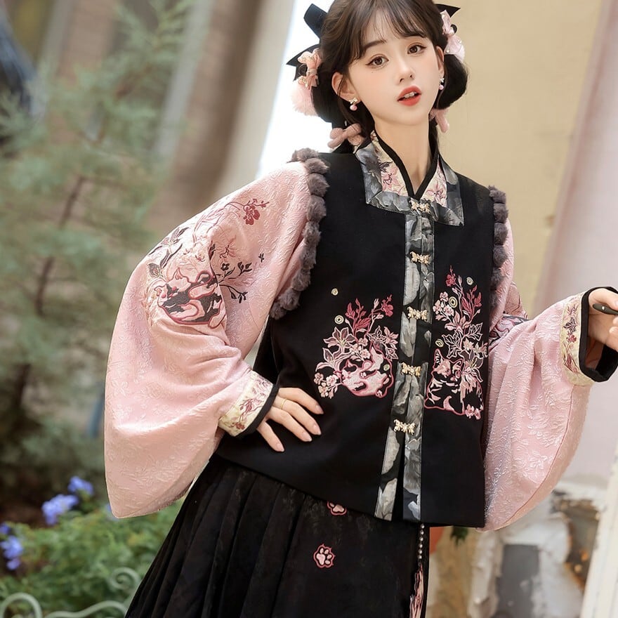 和の情緒とゴシックの耽美さが融合した、豪華な3点セットです。繊細な刺繍を施したベスト、優雅に揺れる広袖トップス、そして気品あるロングスカートが、唯一無二のシルエットを描きます。ピンクと黒の配色が甘すぎず、凛とした大人の可愛らしさを演出。お茶会やイベント、特別な日の装いにふさわしい一着です。