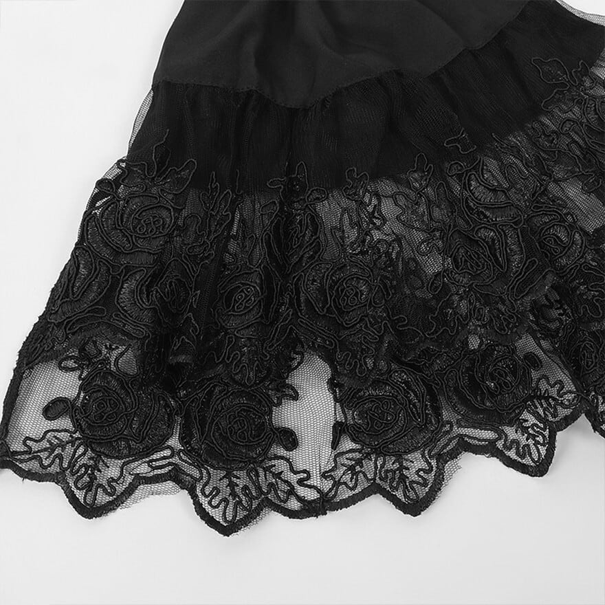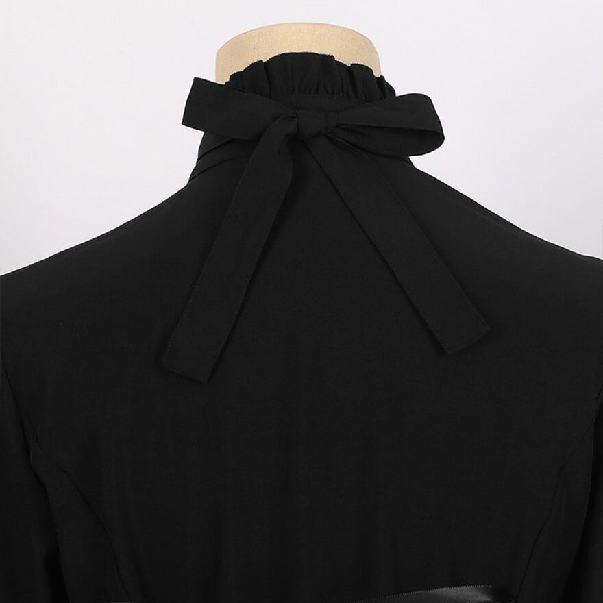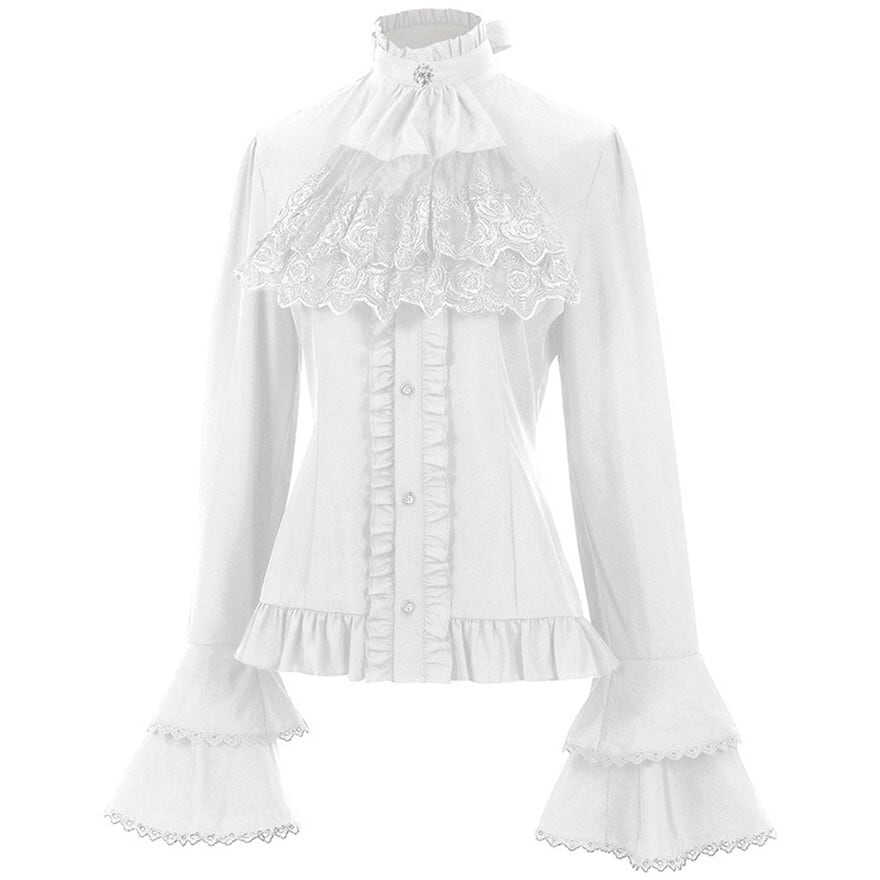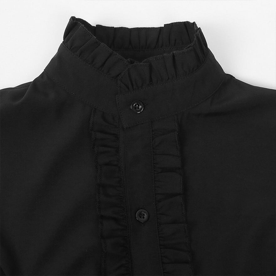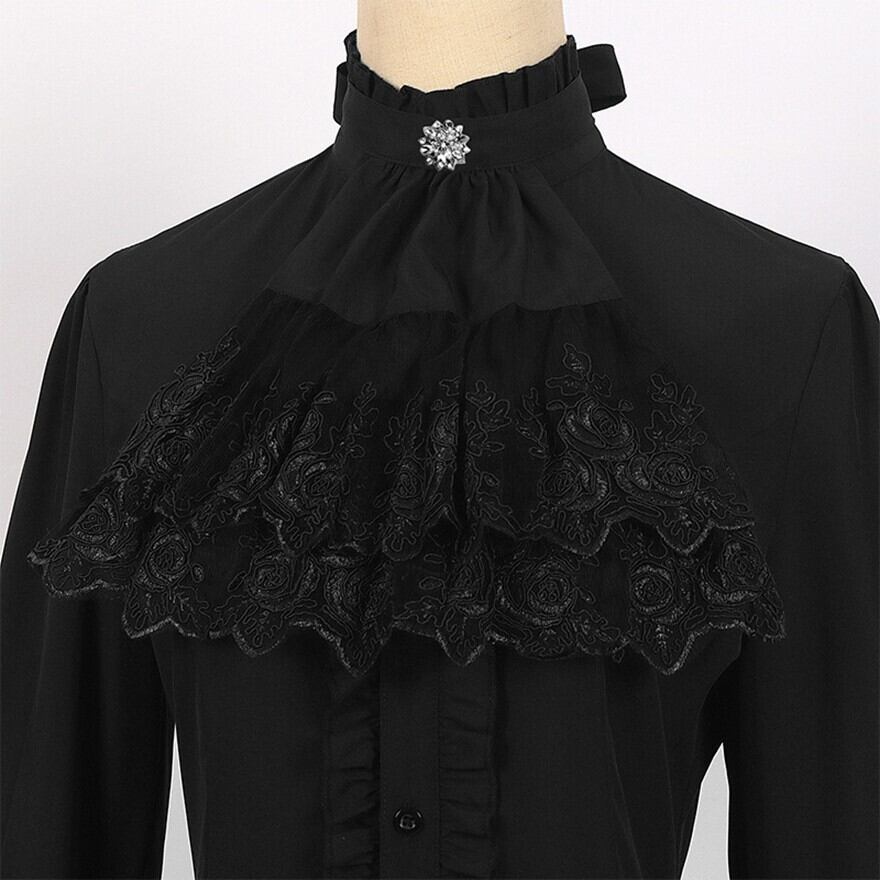 圧倒的な存在感を放つ、至高のゴスロリ系ブラウスです。豪華な三段フリルの姫袖と、繊細なレースをあしらったジャボ風の立ち襟がクラシカルな気品を演出。