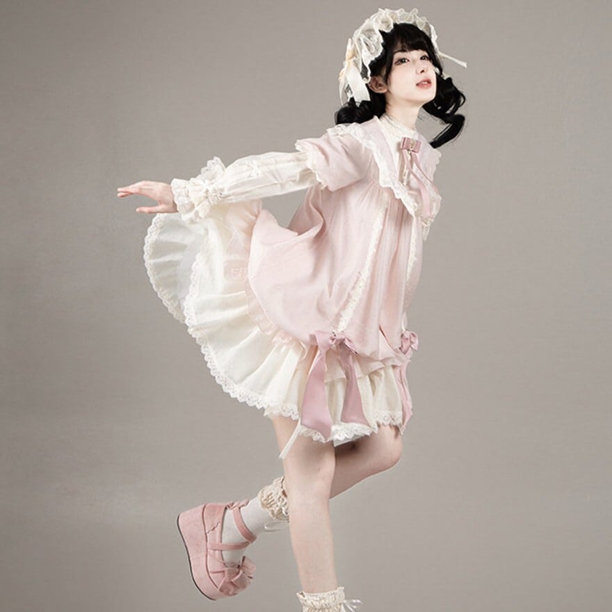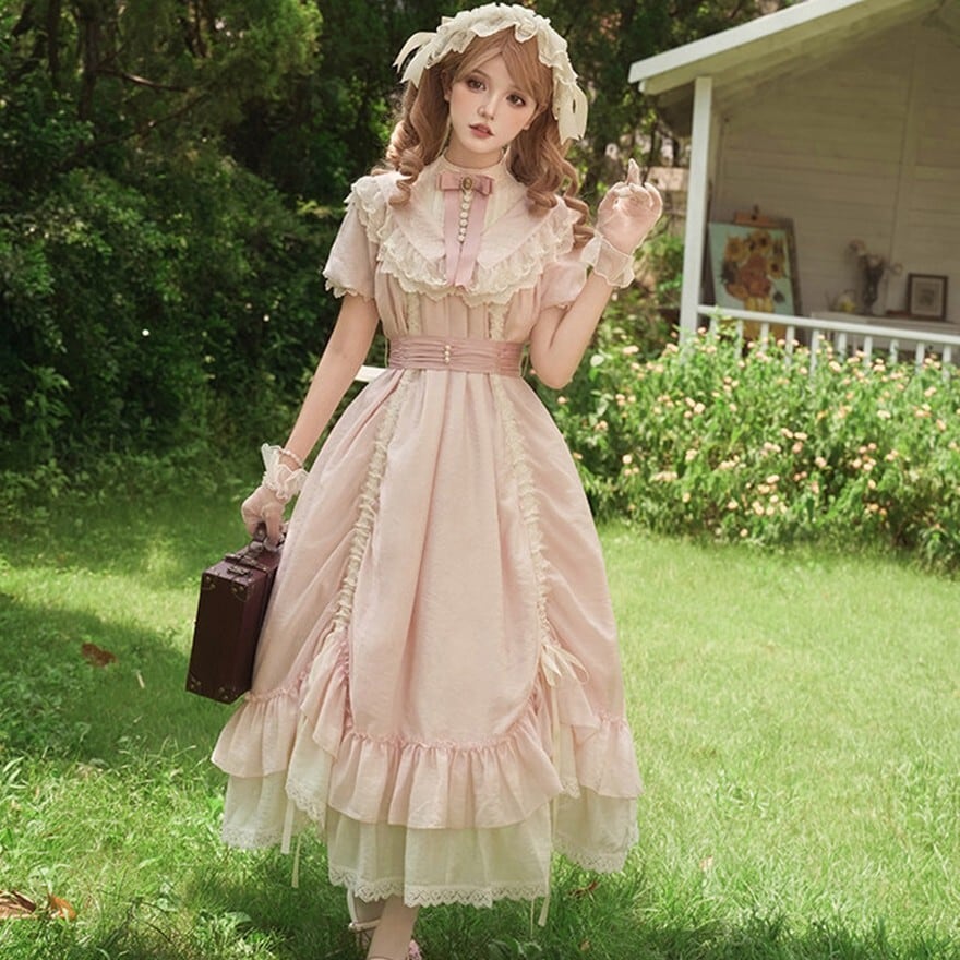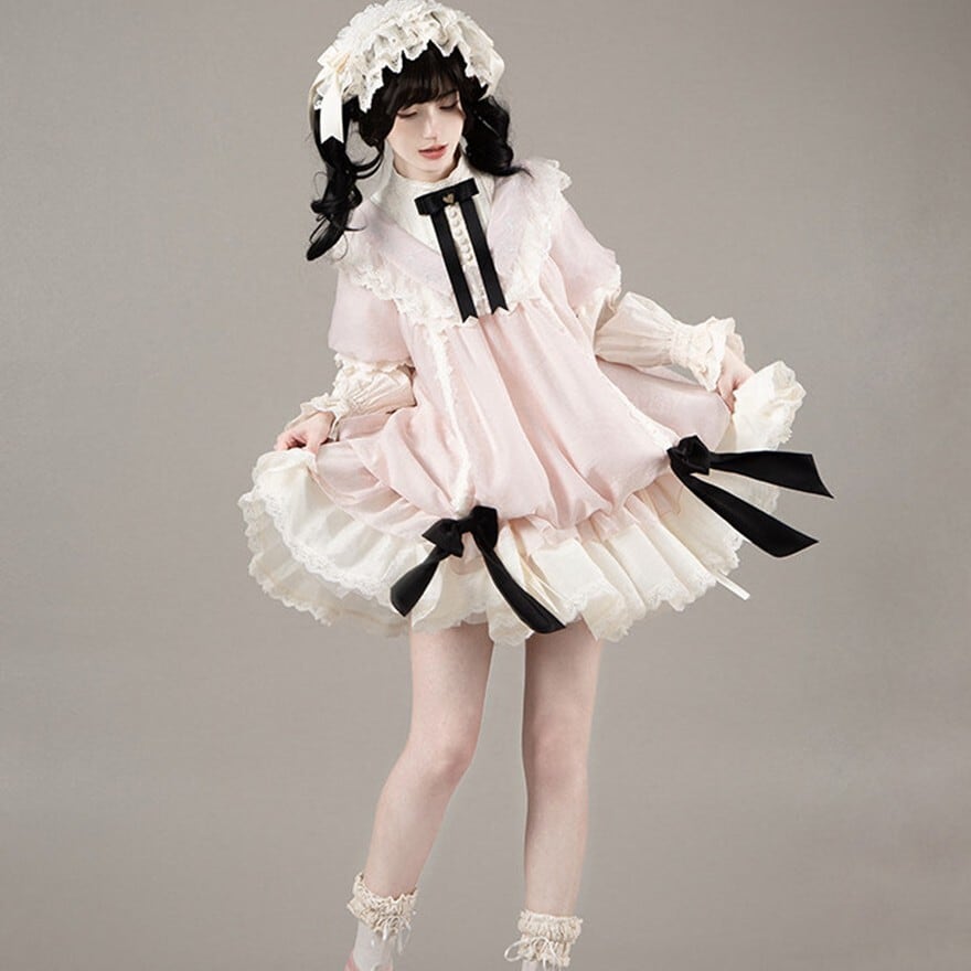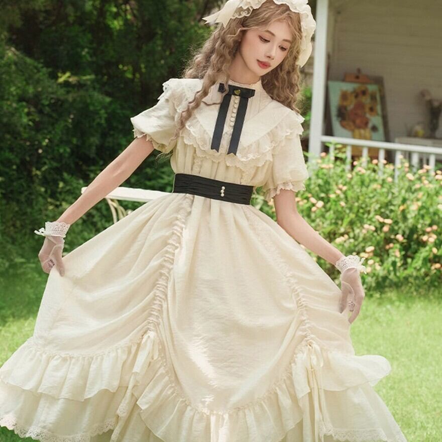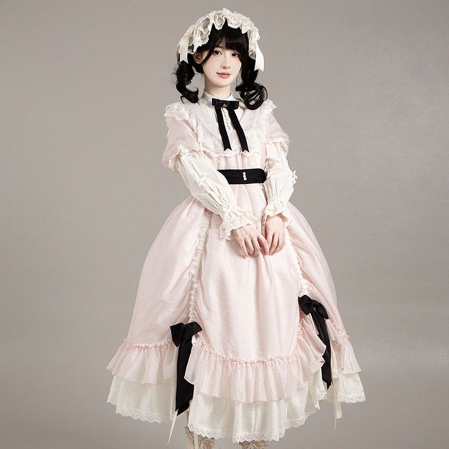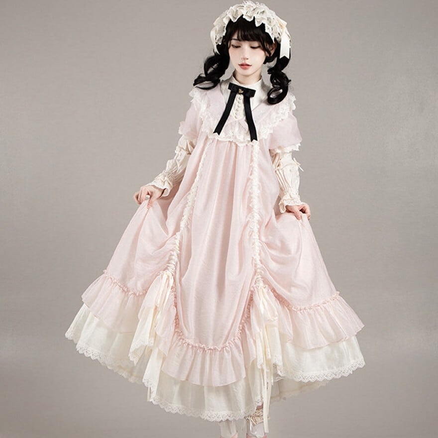 たっぷりのフリルとリボンをあしらった、愛らしい甘ロリワンピースです。繊細なレースを施した付け袖がセットになっており、気分に合わせて2WAYの着こなしが楽しめます。ふんわり広がるティアードシルエットと、胸元のリボンがドーリーな雰囲気を演出する、特別な日にぴったりの一着です。