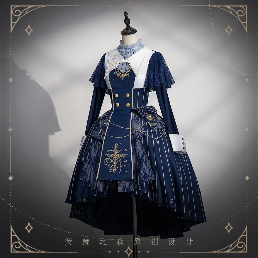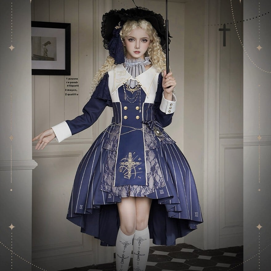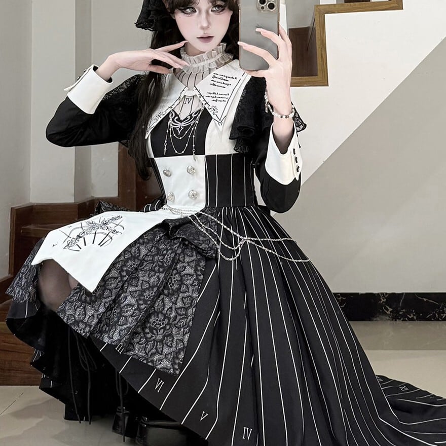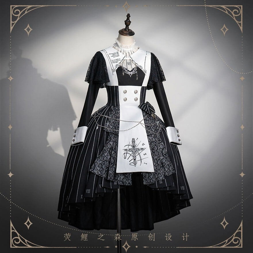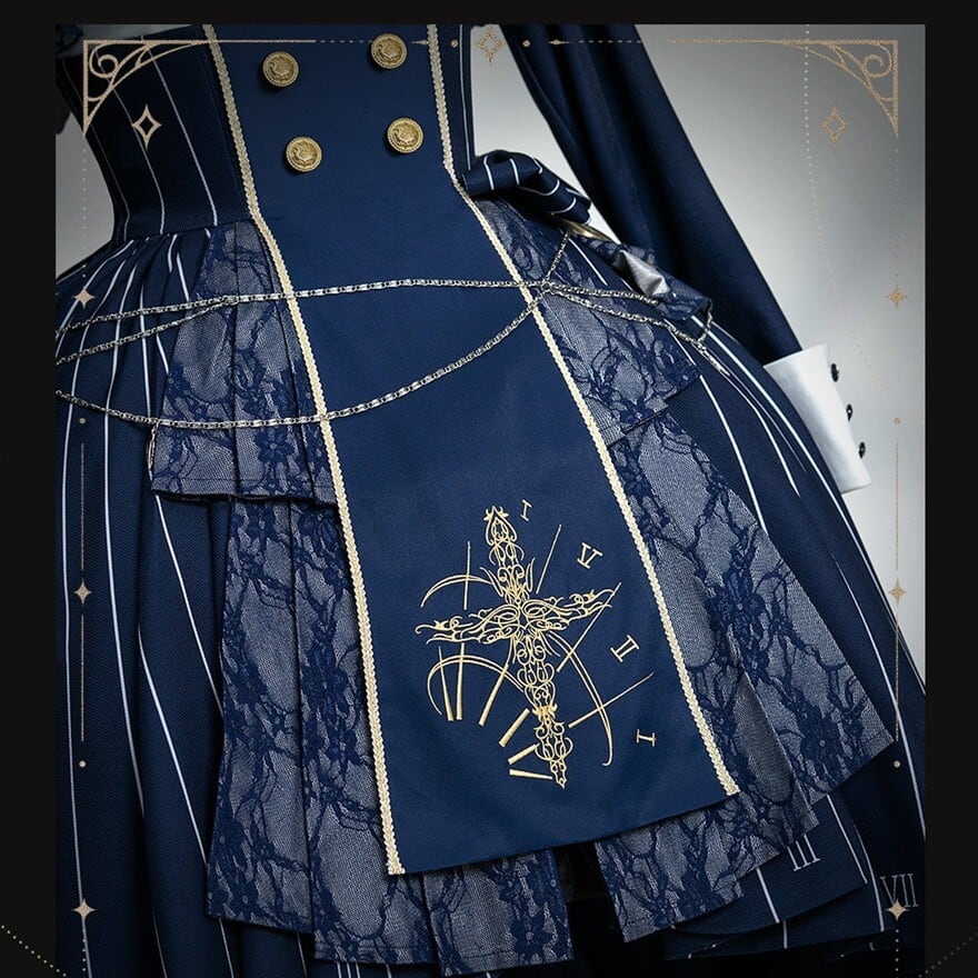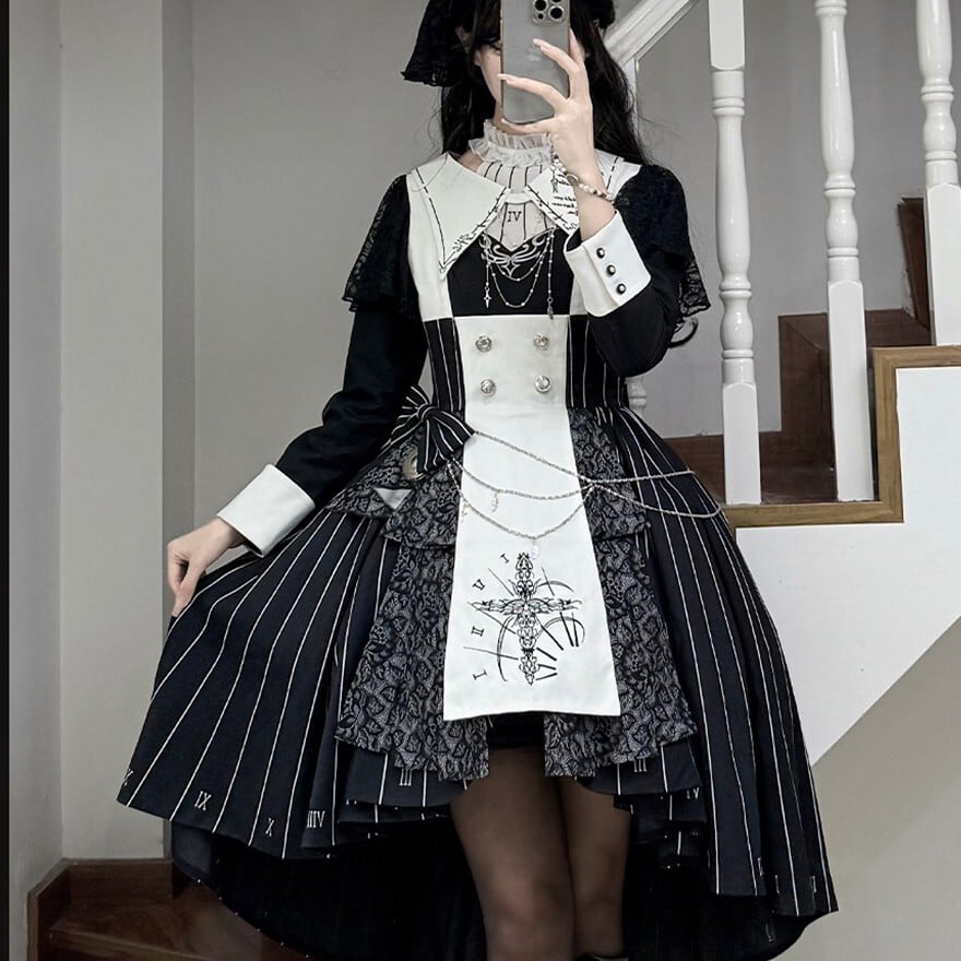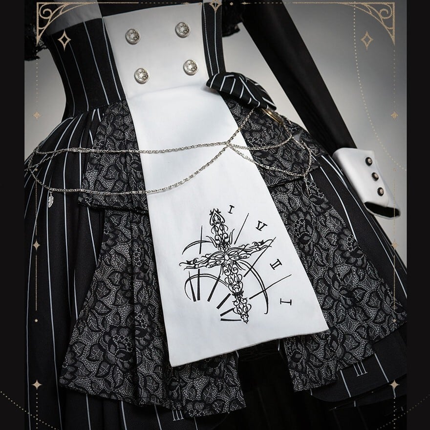 緻密な時計の文字盤プリントと精巧な十字架刺繍を施した、重厚感溢れるゴシックセットアップ。フロントには4つのシルバー/ゴールドボタンを配置し、脱ぎ着のしやすさとデザイン性を両立。フロントは膝上のミニ丈、バックはロング丈のフィッシュテール構造で、美脚効果とエレガントな立ち姿を同時に実現しました。