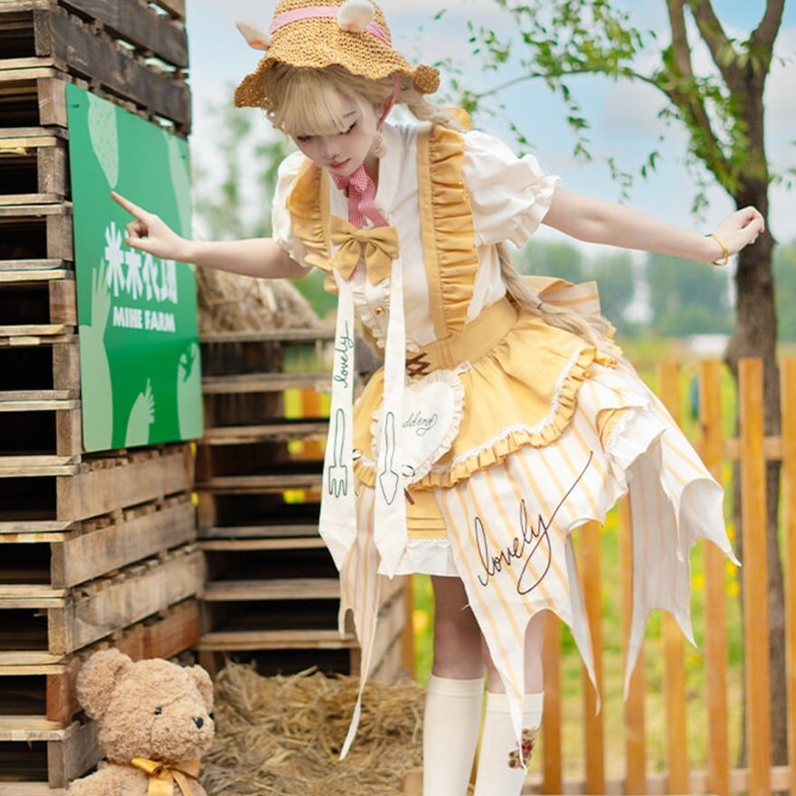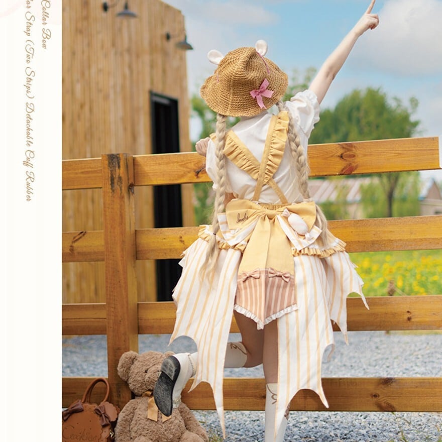 襟元から伸びるロングタイには「lovely」の文字とスプーン・フォークの刺繍、さらに小さなブラウンのリボンがあしらわれています。