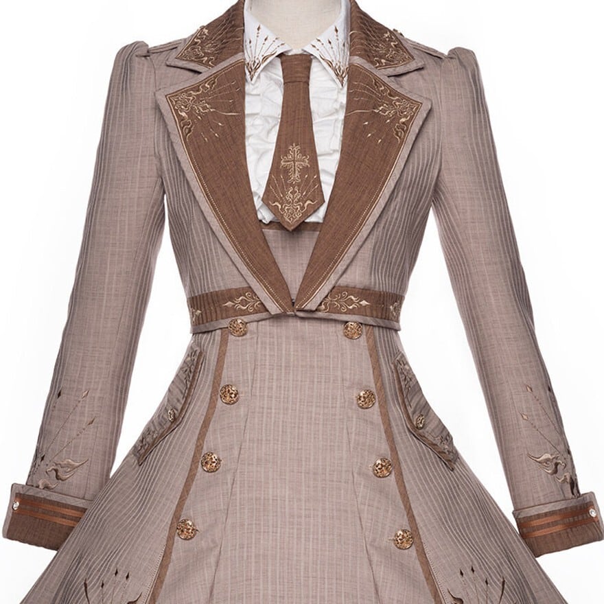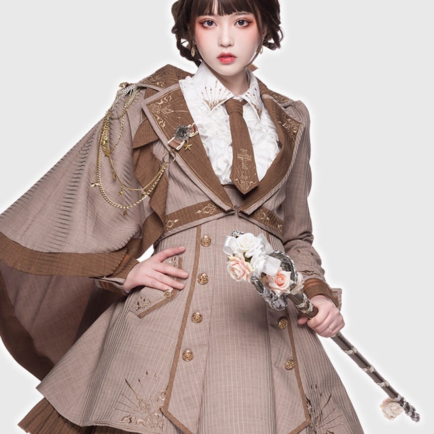 ブラウンの生地に、ゴールドのダブルボタンが 8 つ配置された士官風のデザインです。 両サイドにはボタン付きのフラップポケットがあり、前裾の両端には左右対称の装飾刺繍が施されています。 スカートの裾からは、濃いブラウンのプリーツ状の裏地がのぞく多層的な構造になっています。