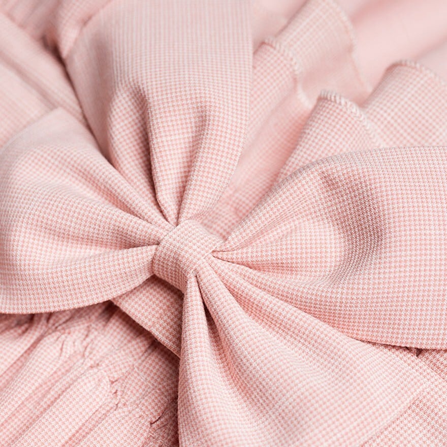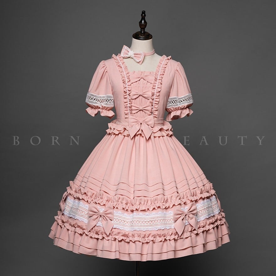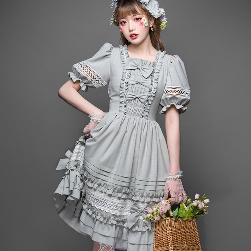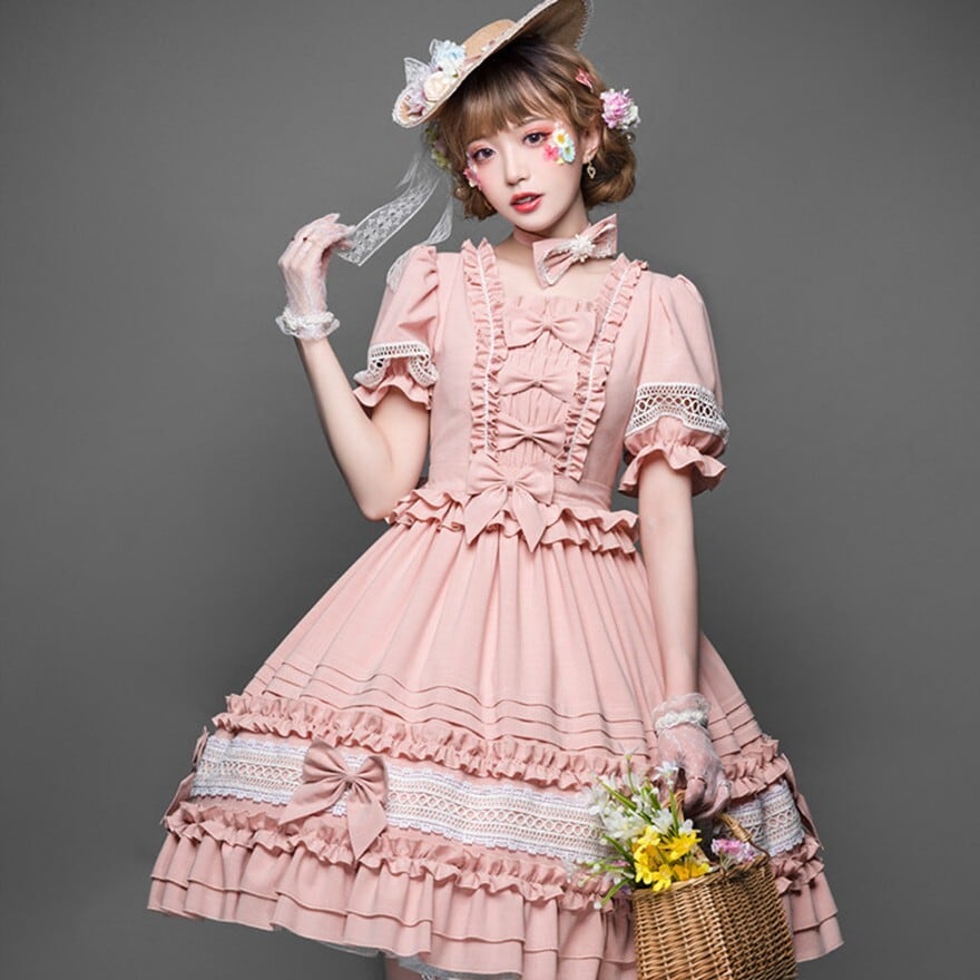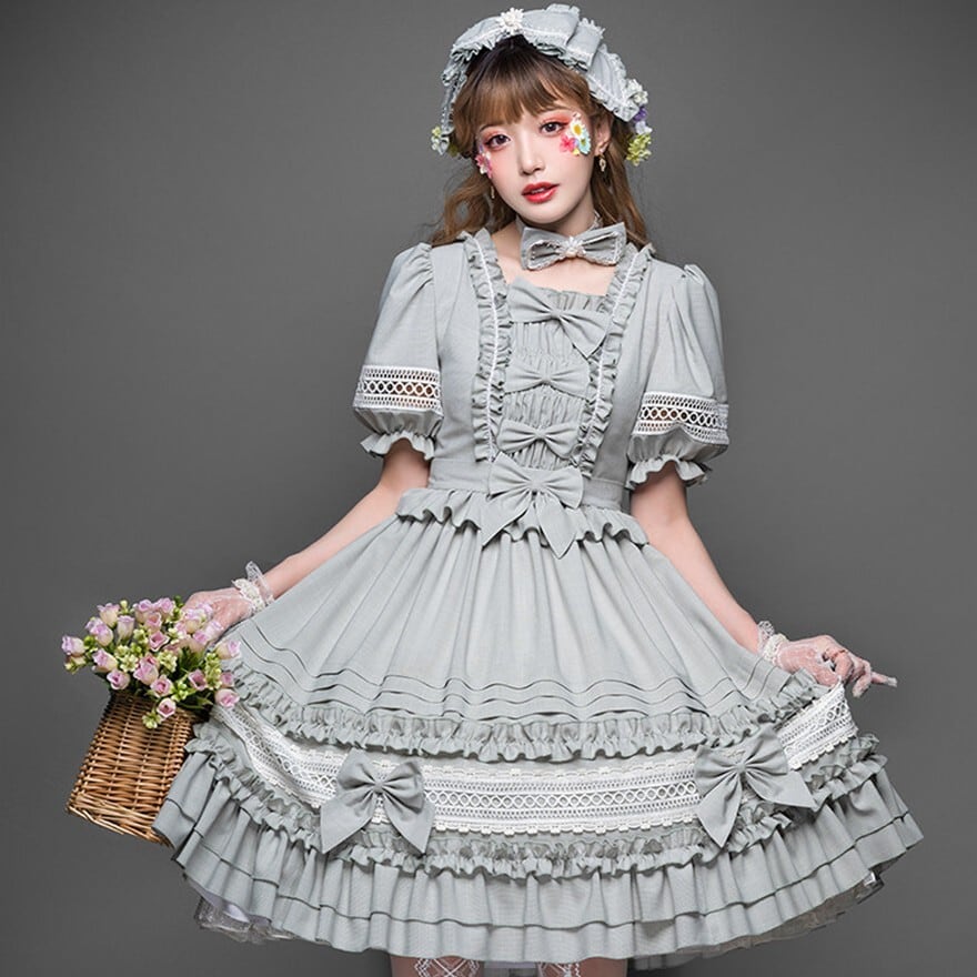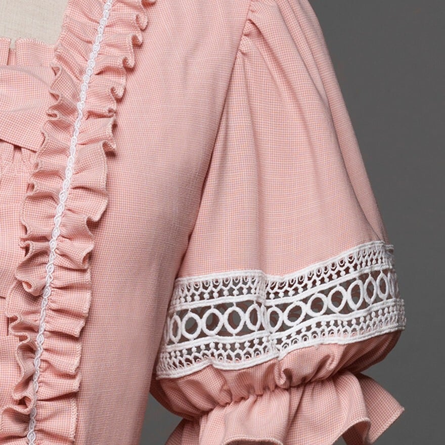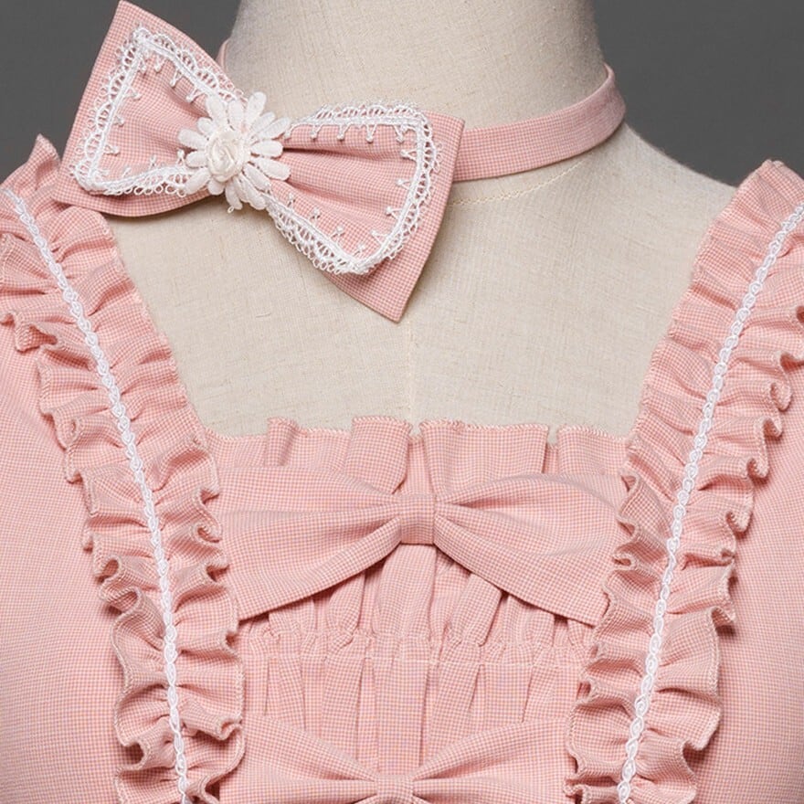 スクエアネックの襟元と胸元には縦にフリルと4つのリボンが配置されています。袖はパフスリーブで、中央に白いレースの透かしデザインがあります。ウエスト部分にはフリルの切り替えがあり、スカート部分は下部に3段のティアードフリル、さらにレース帯と左右にリボンがあしらわれた豪華な構造です。