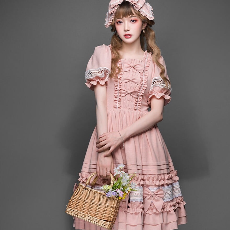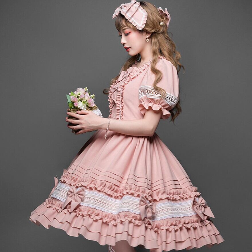 このワンピースは、胸元のリボンからスカート裾の3段フリルまで、計算された装飾が施されています。パニエ(画像からは不明)を合わせずとも重なり合うフリルが立体感を生み出し、一着で理想の世界観を表現できるよう設計されています。