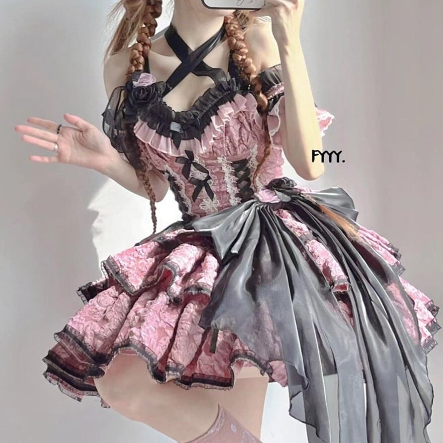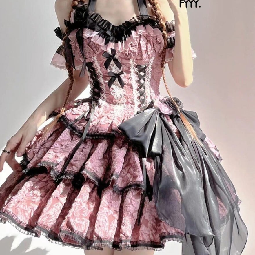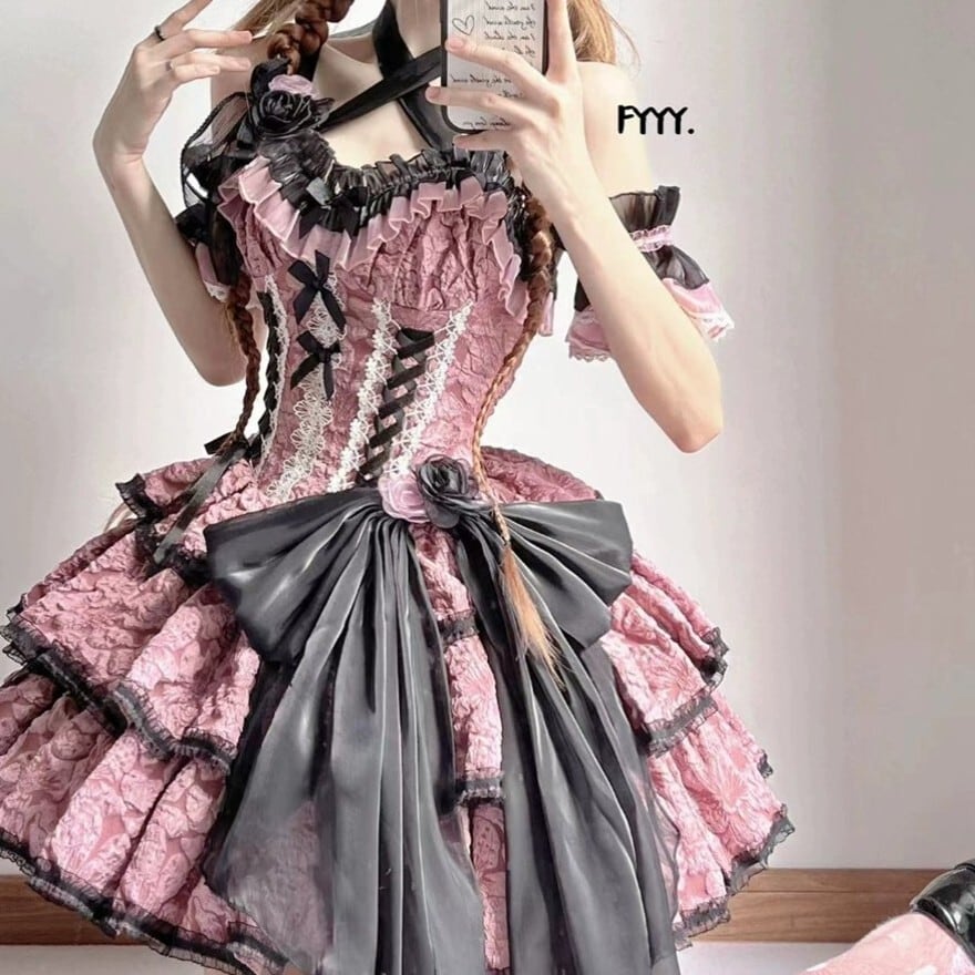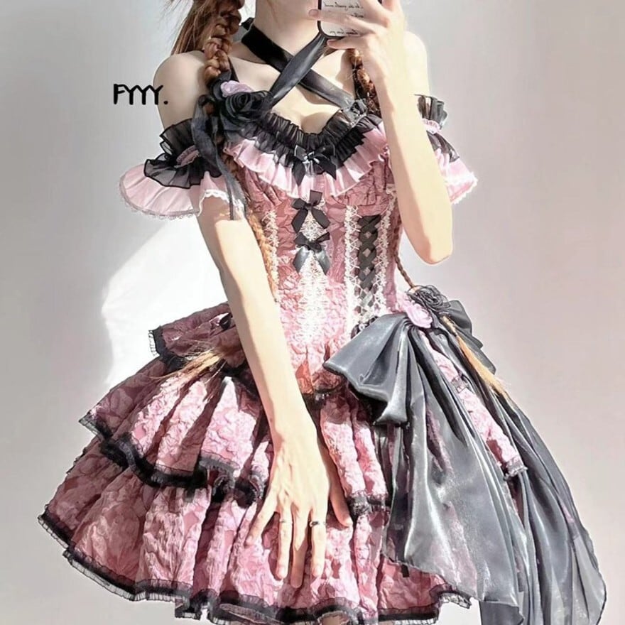 甘ロリ・量産型スタイルの半袖ワンピースです。胸元に配された4連のリボンとフリル、そしてボリューム感のある3段のティアードスカートが特徴。パフスリーブには繊細なレースの切り替えが施されており、一着でドールのようなシルエットを完成させます。お茶会やイベント、SNS撮影に最適な華やかな一着です。