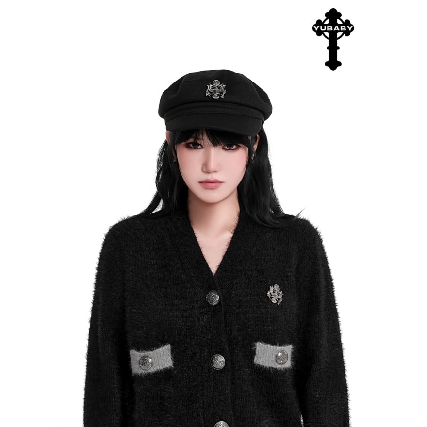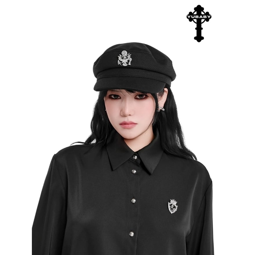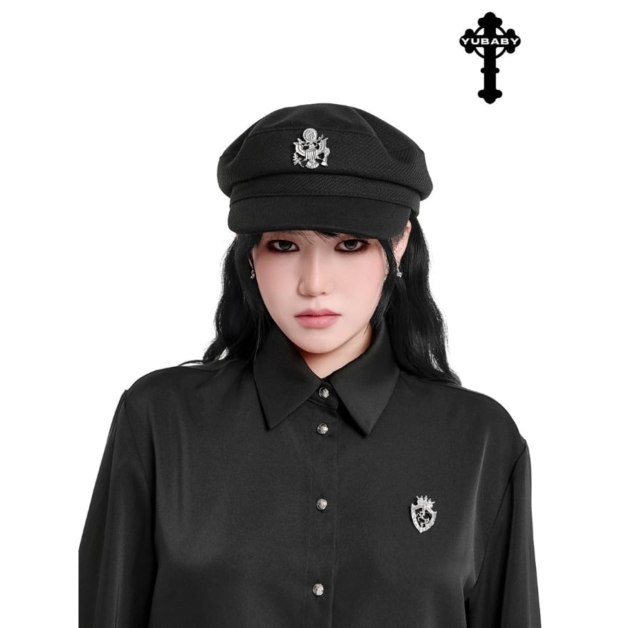 紋章付きのフロントデザインとつば付きのシルエットが、顔まわりをすっきり引き締めます。