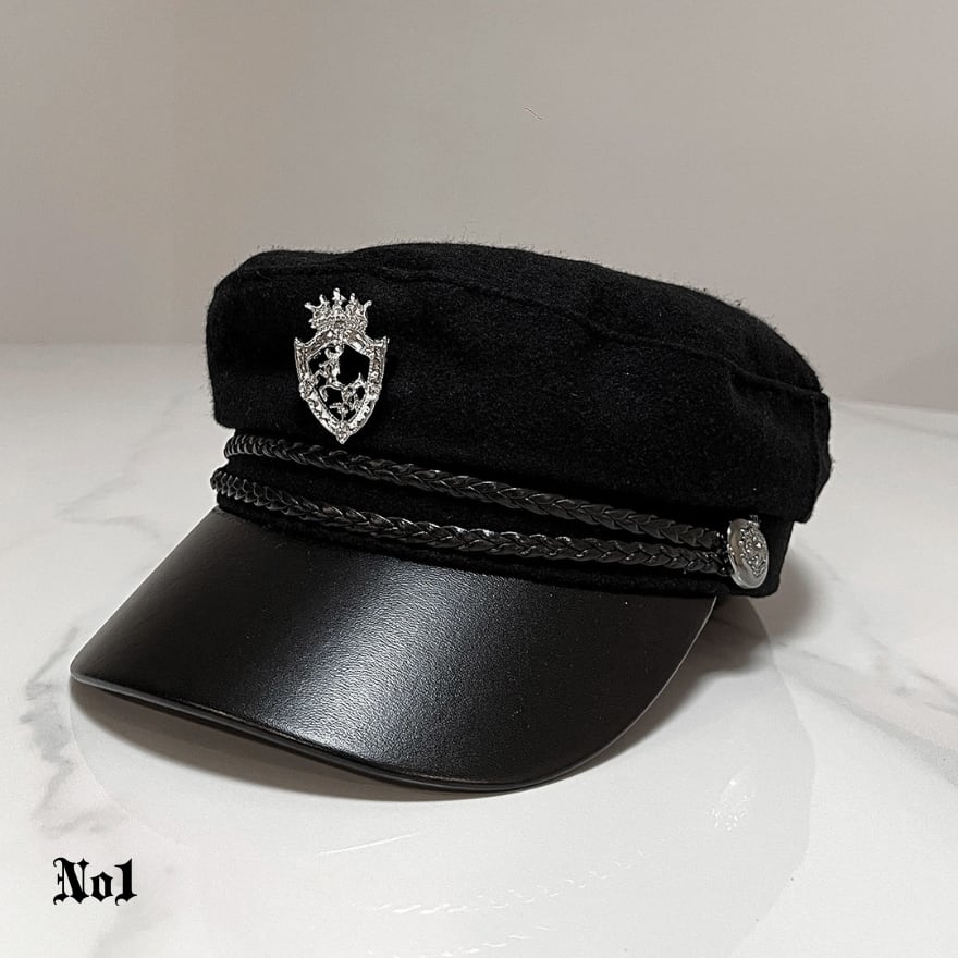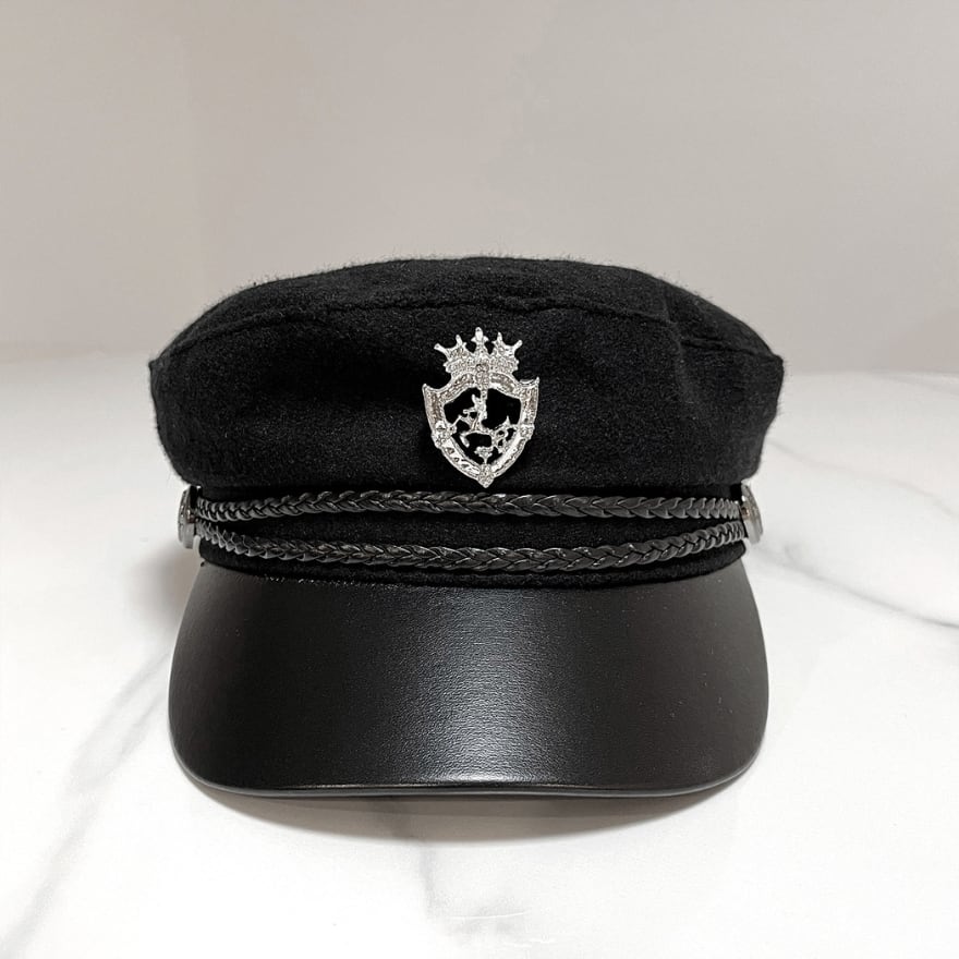 つば付きのマリンキャップをベースに、フロントへメタル調の紋章モチーフを添えたデザインです。ブラック系とホワイト系の展開があり、黒は引き締まった印象、白は軽さのある印象にまとまります。フロントラインは編み込み風のディテール入りタイプと、すっきりした帯状デザインのタイプがあります。