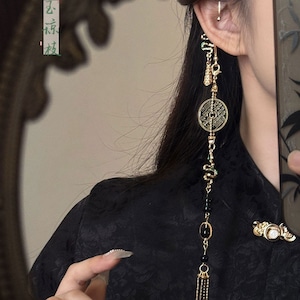 上部には蛇モチーフを取り入れ、そこから古銭チャームや黒ビーズ、細やかな装飾が連なる縦長デザインに仕上げています。ゴールド調の金具が華やかさを添えつつ、黒のアクセントが全体をきりっと引き締めてくれるのもポイントです。派手すぎず、それでいて視線を引く存在感があり、中華ゴシックらしい妖しさと上品さをバランスよく楽しめる耳飾りです。