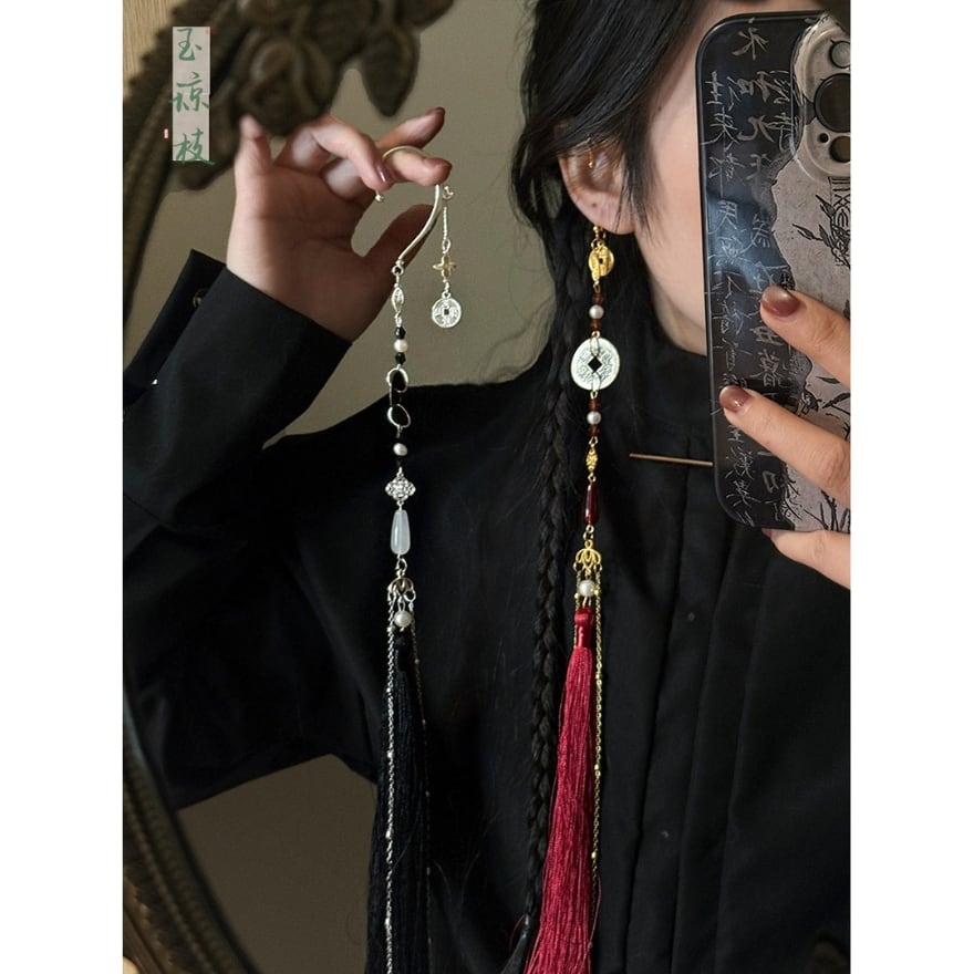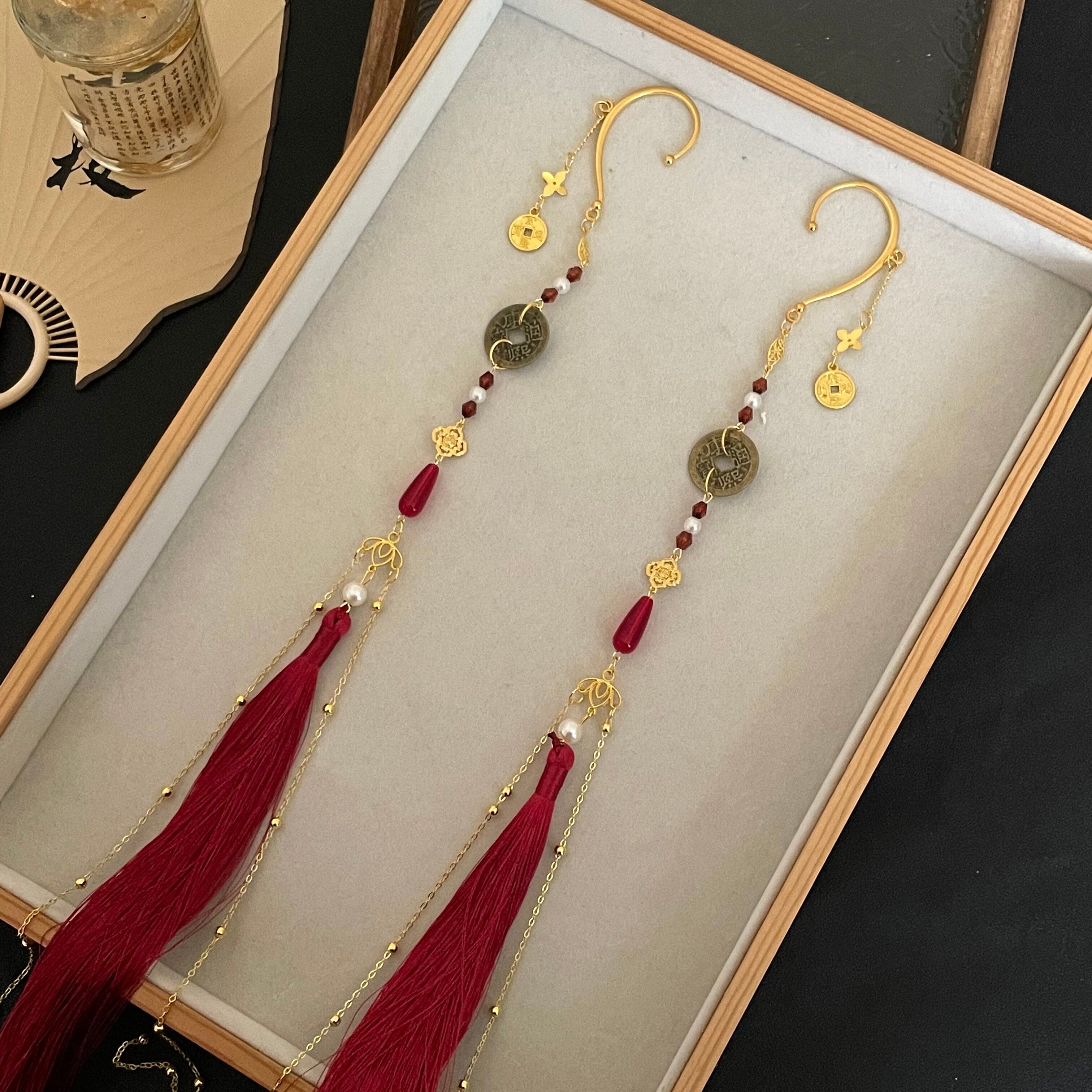 中華ゴシックの装いに妖しく上品な余韻を添える、単品タイプのロング耳飾りです。