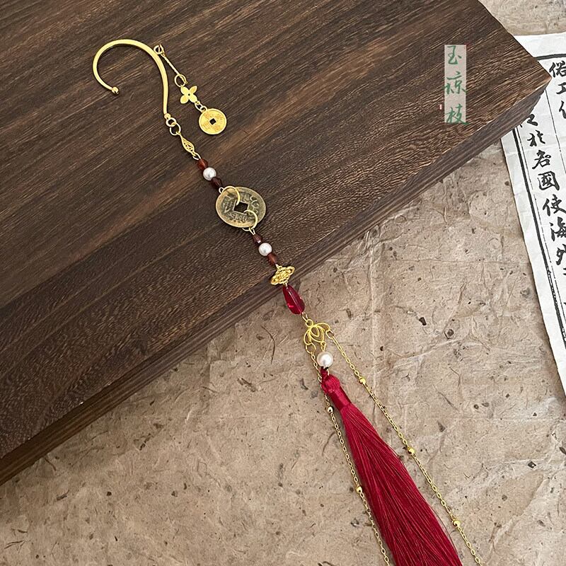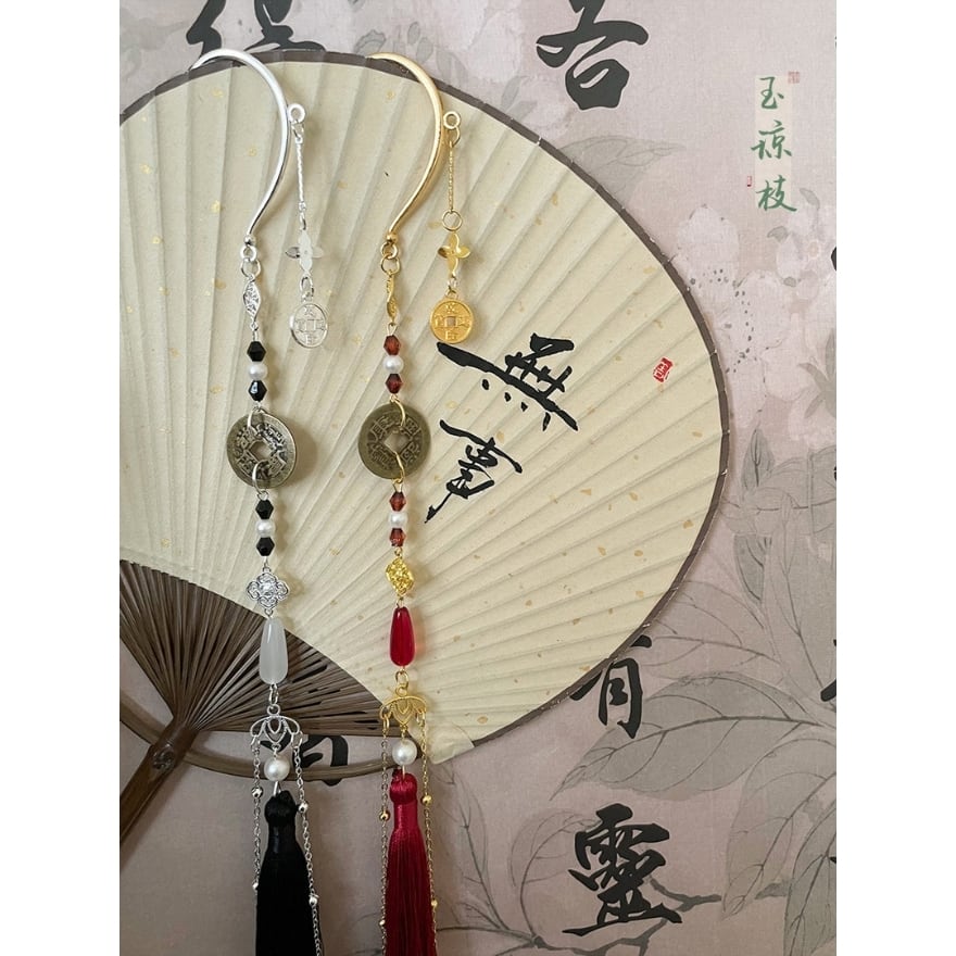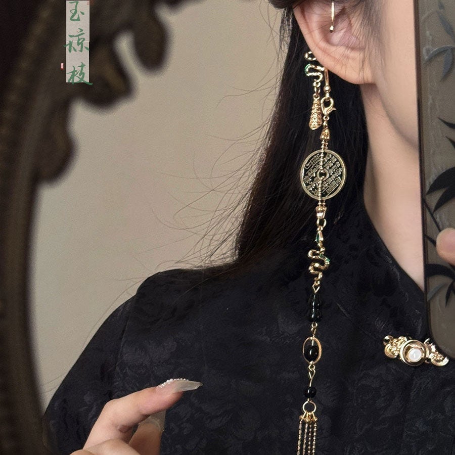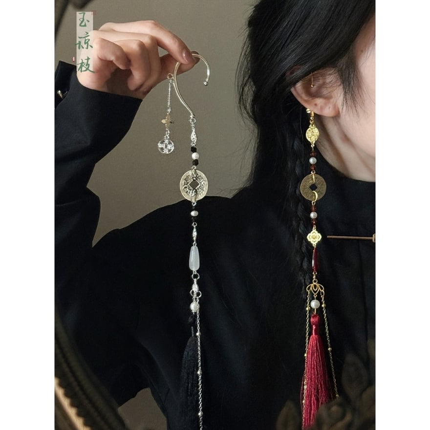 この単品耳飾りは、古銭モチーフの印象深さにロングタッセルのしなやかな揺れ感を重ねることで、片耳でもしっかり雰囲気をつくりやすいのが魅力です。赤黒配色がコーデを引き締めやすく、黒チャイナや中華ゴシックの装いにはもちろん、シンプルな黒トップスへ一点だけ添えても世界観を深めやすくなります。