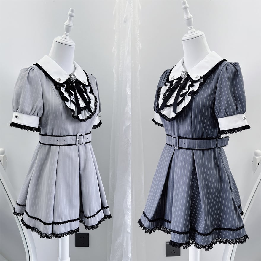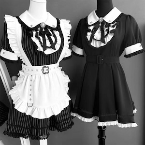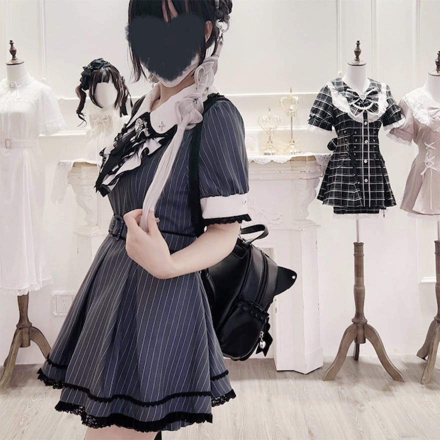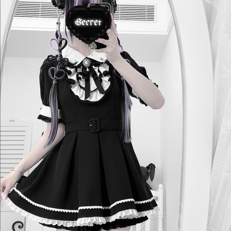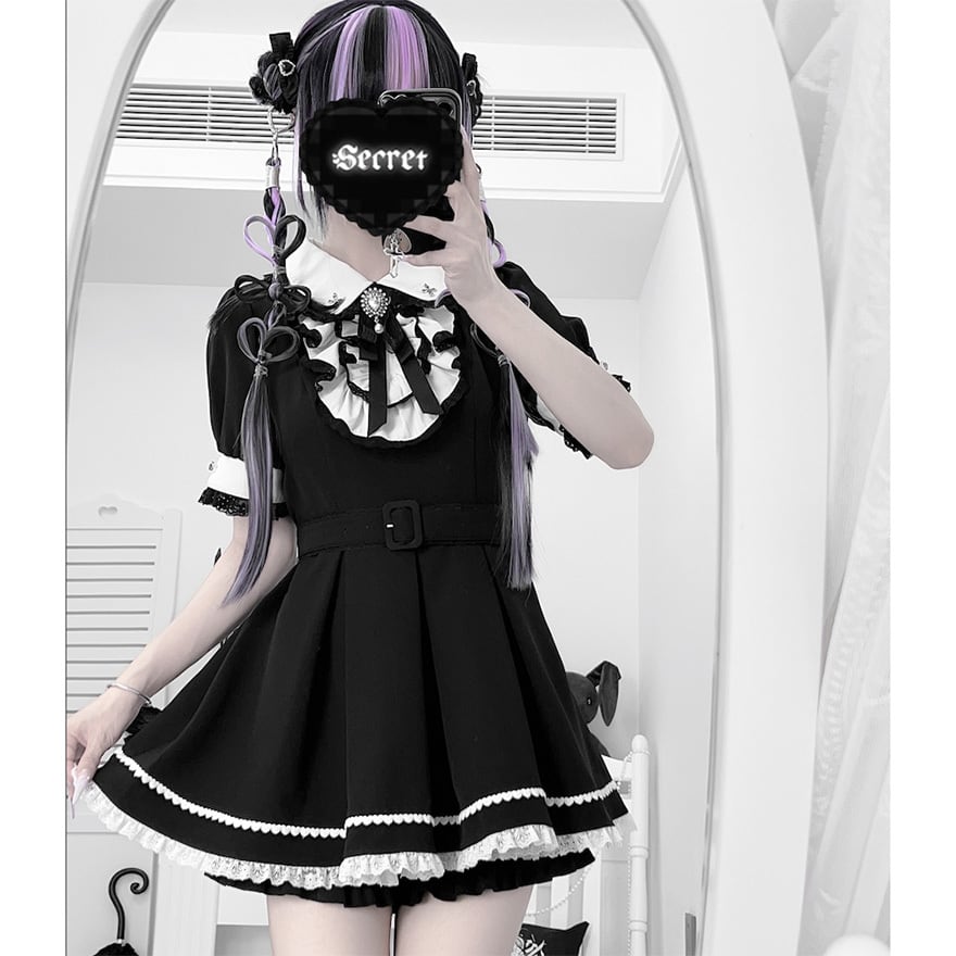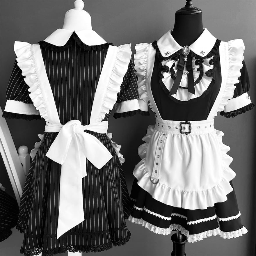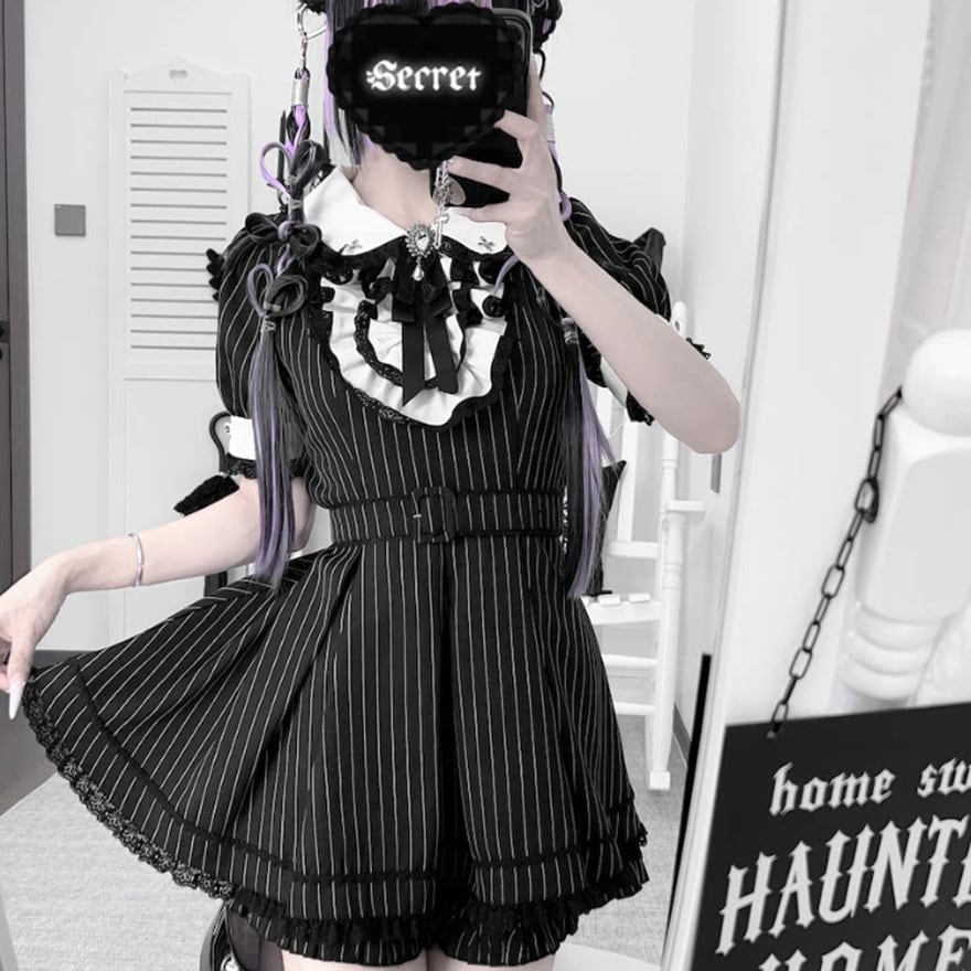 モノトーンの配色にレースやリボンの装飾が加わり、可愛らしさとダークな雰囲気を併せ持つデザインが特徴です。
