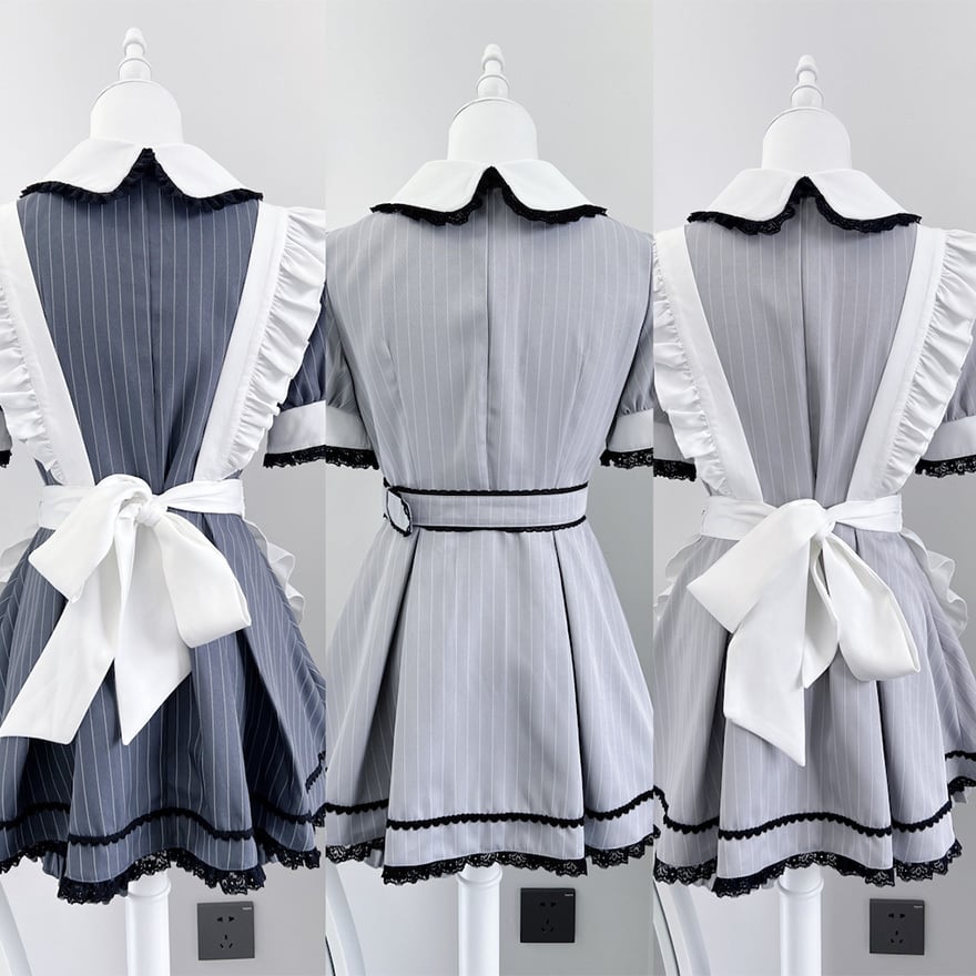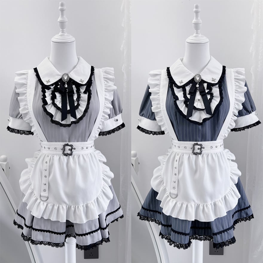 襟元の刺繍や胸元のリボン、エプロンのフリルなど、細部まで装飾が施されていることが画像から確認できます。