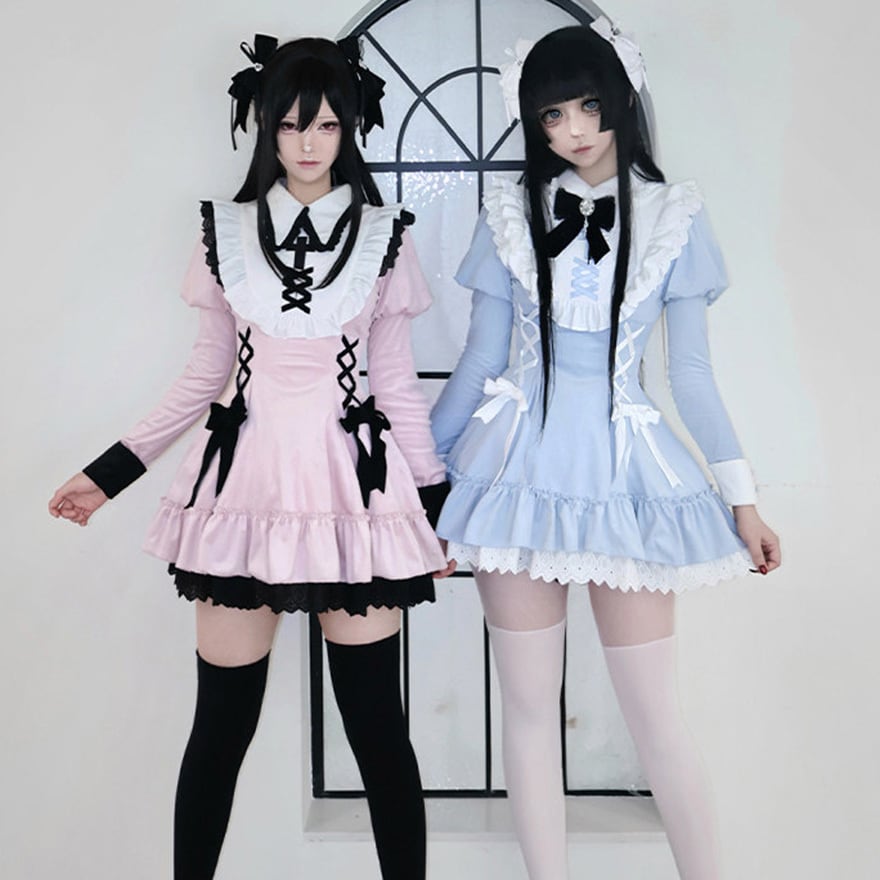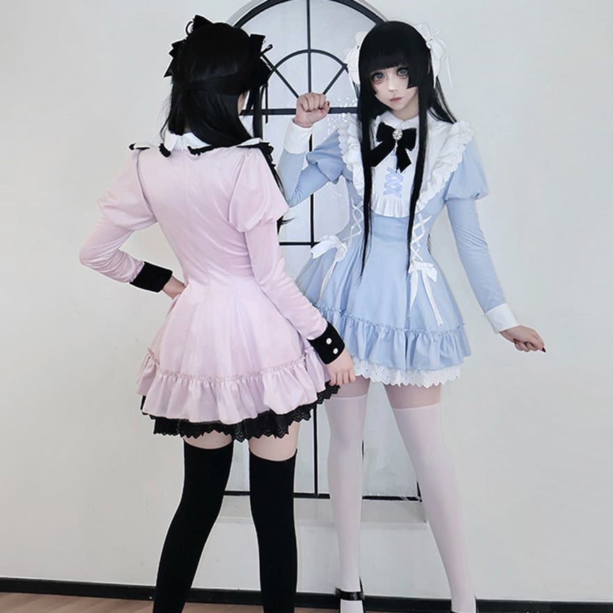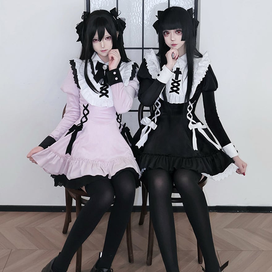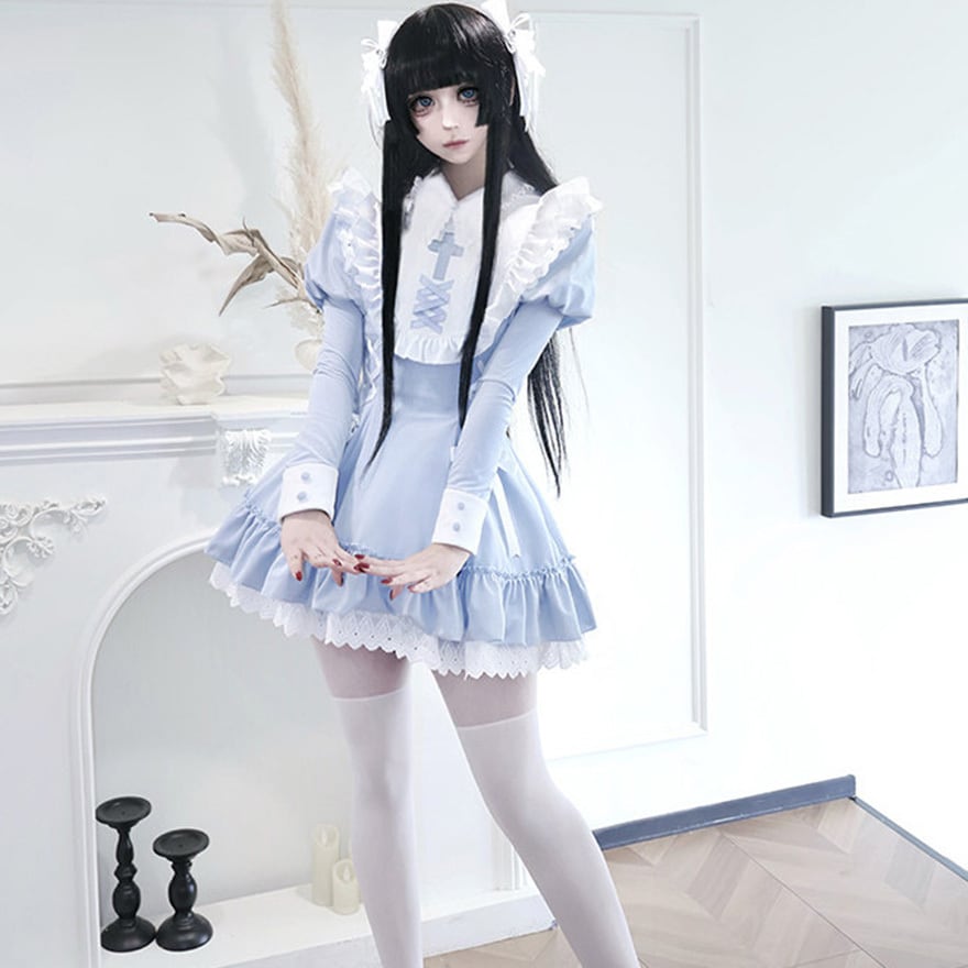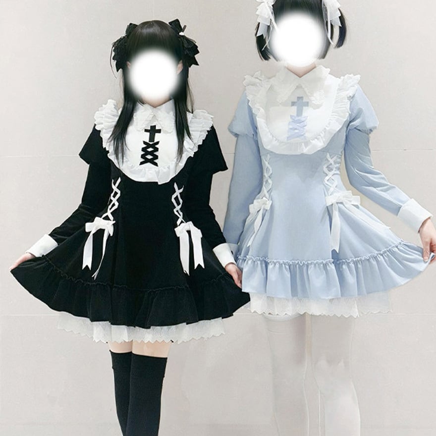 襟には十字架の刺繍があり、胸元と脇にリボンによる編み上げが配置されています。袖口は配色切り替え、裾は二段のフリルとレースが重なっています。