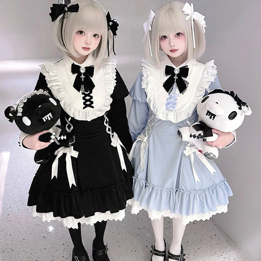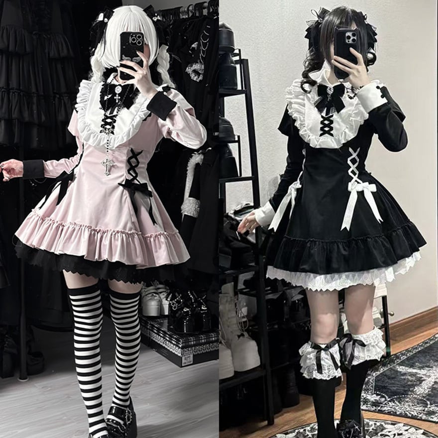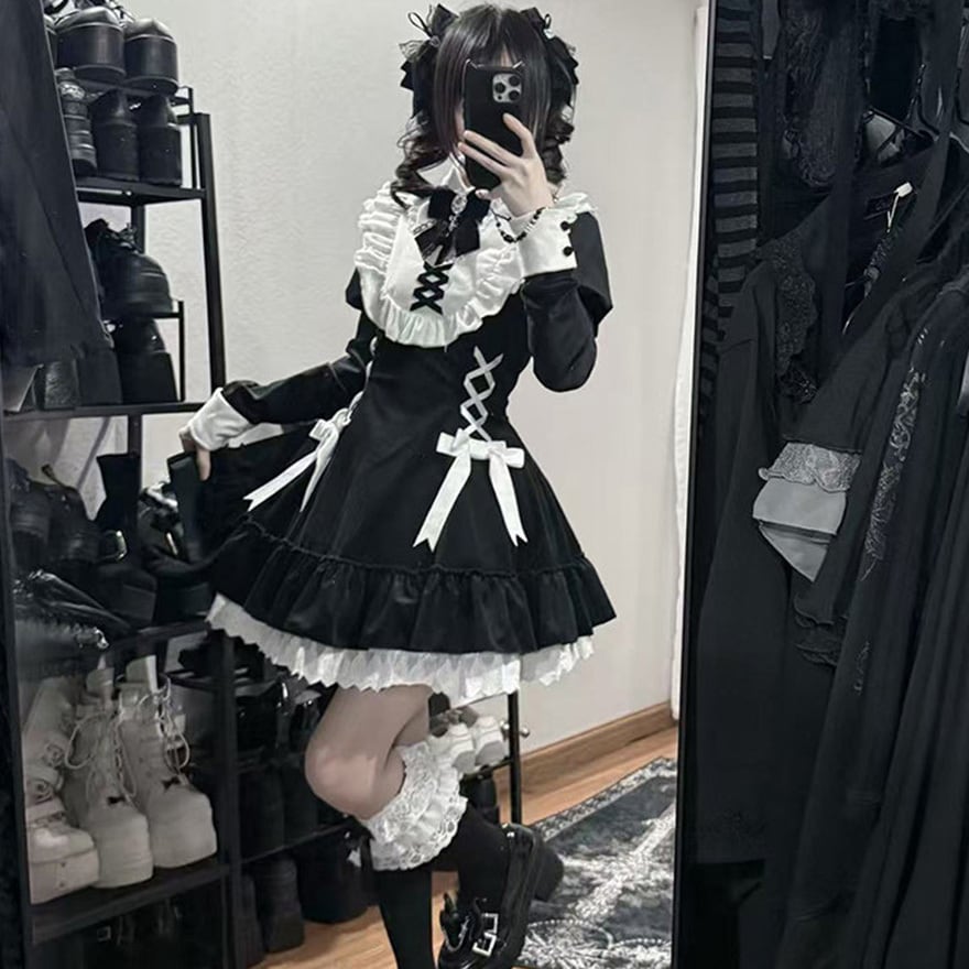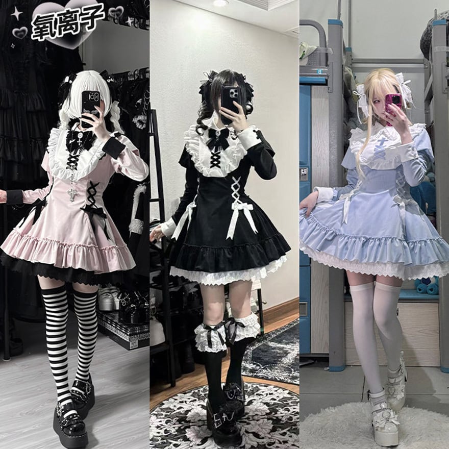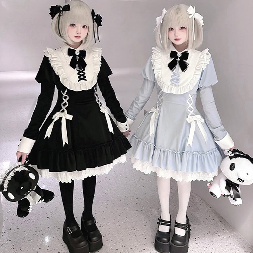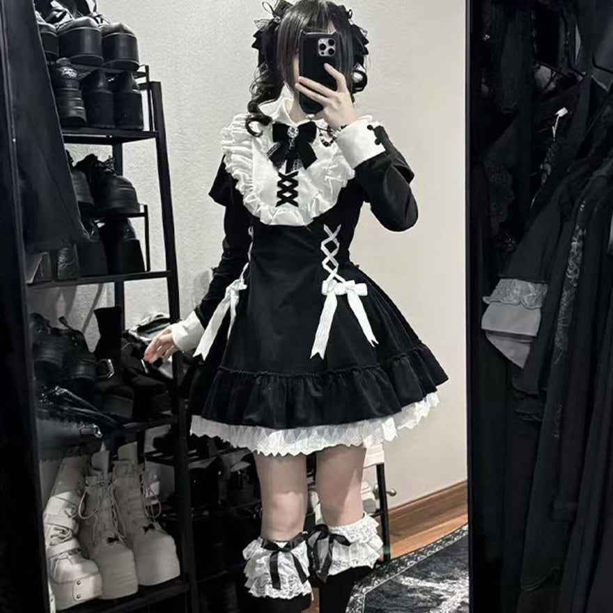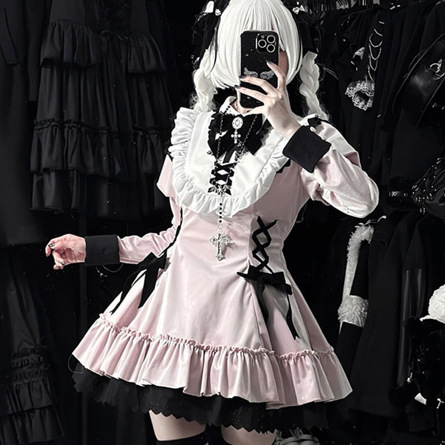 地雷系ジャンルの四点セットです。クロス刺繍が施された襟と、胸元および両脇の編み上げ意匠が特徴の長袖ワンピースに、リボンブローチとヘアクリップが付属します。