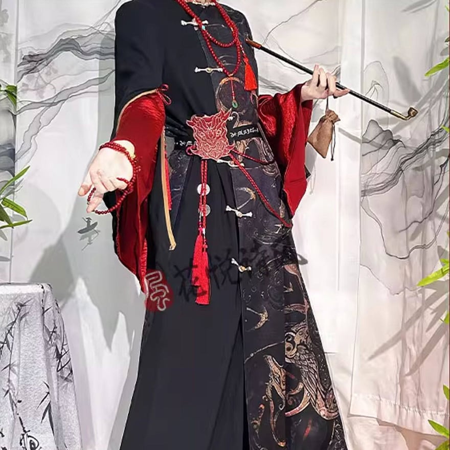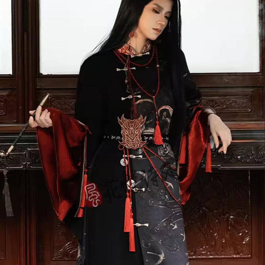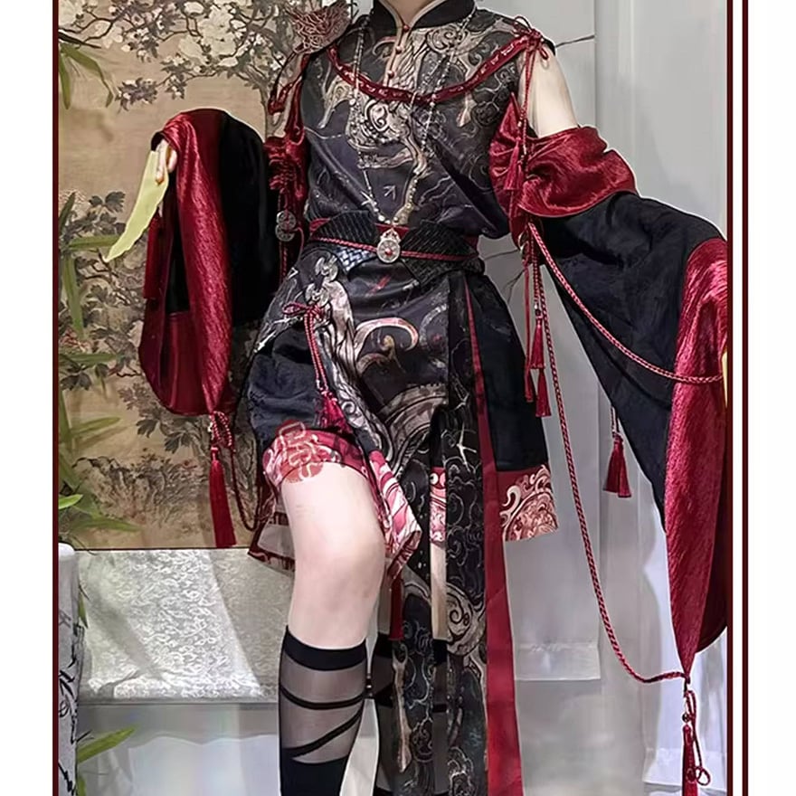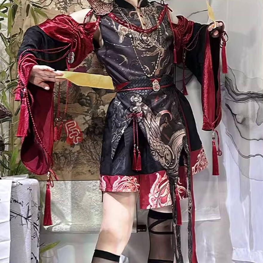 赤と黒を基調とした配色に伝統的な文様の刺繍やタッセルが施されており、コンセプトカフェの衣装やライブの参戦服、撮影用として適しています。